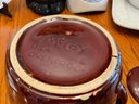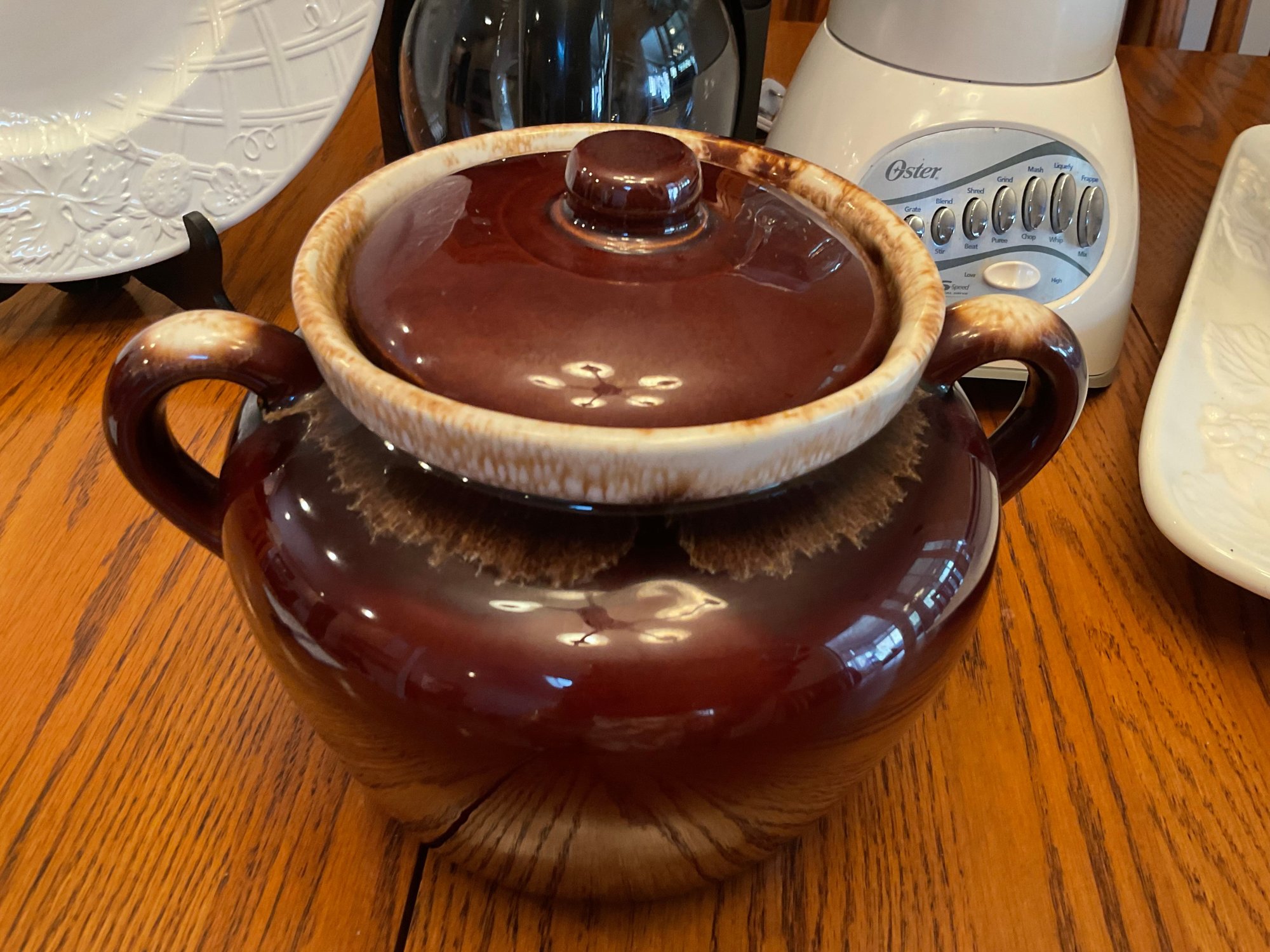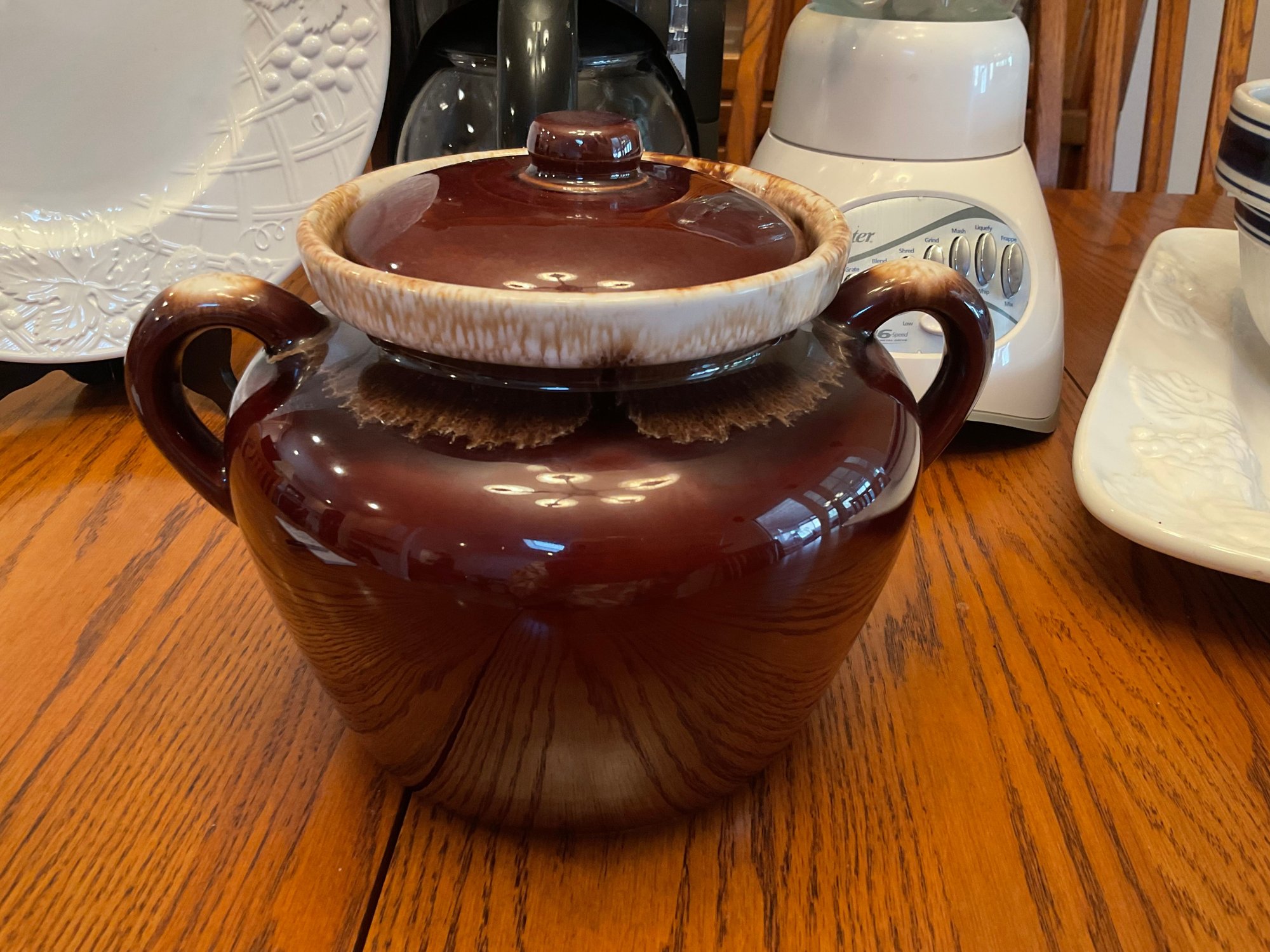 McCoy Pottery Bean Pot: Classic brown glazed stoneware with handles and matching lid (approx. 7" text{H} times 10" text{W}).