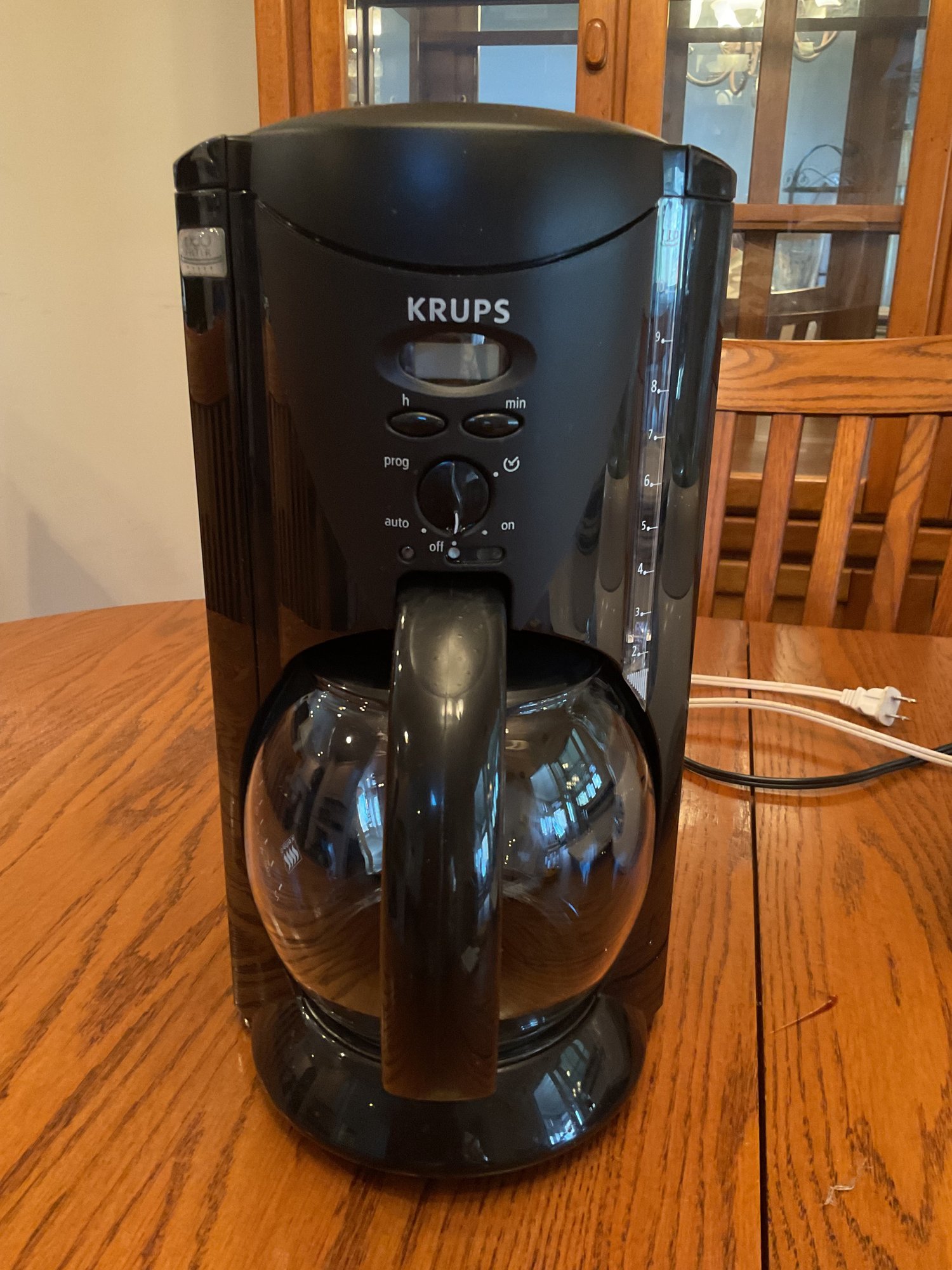 Krups Programmable Coffee Maker: Sleek black finish with a glass carafe.