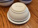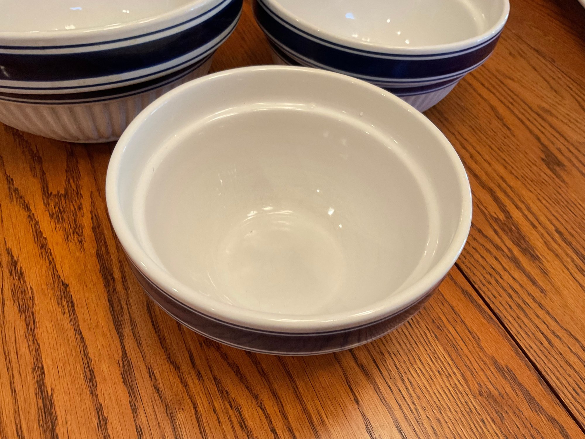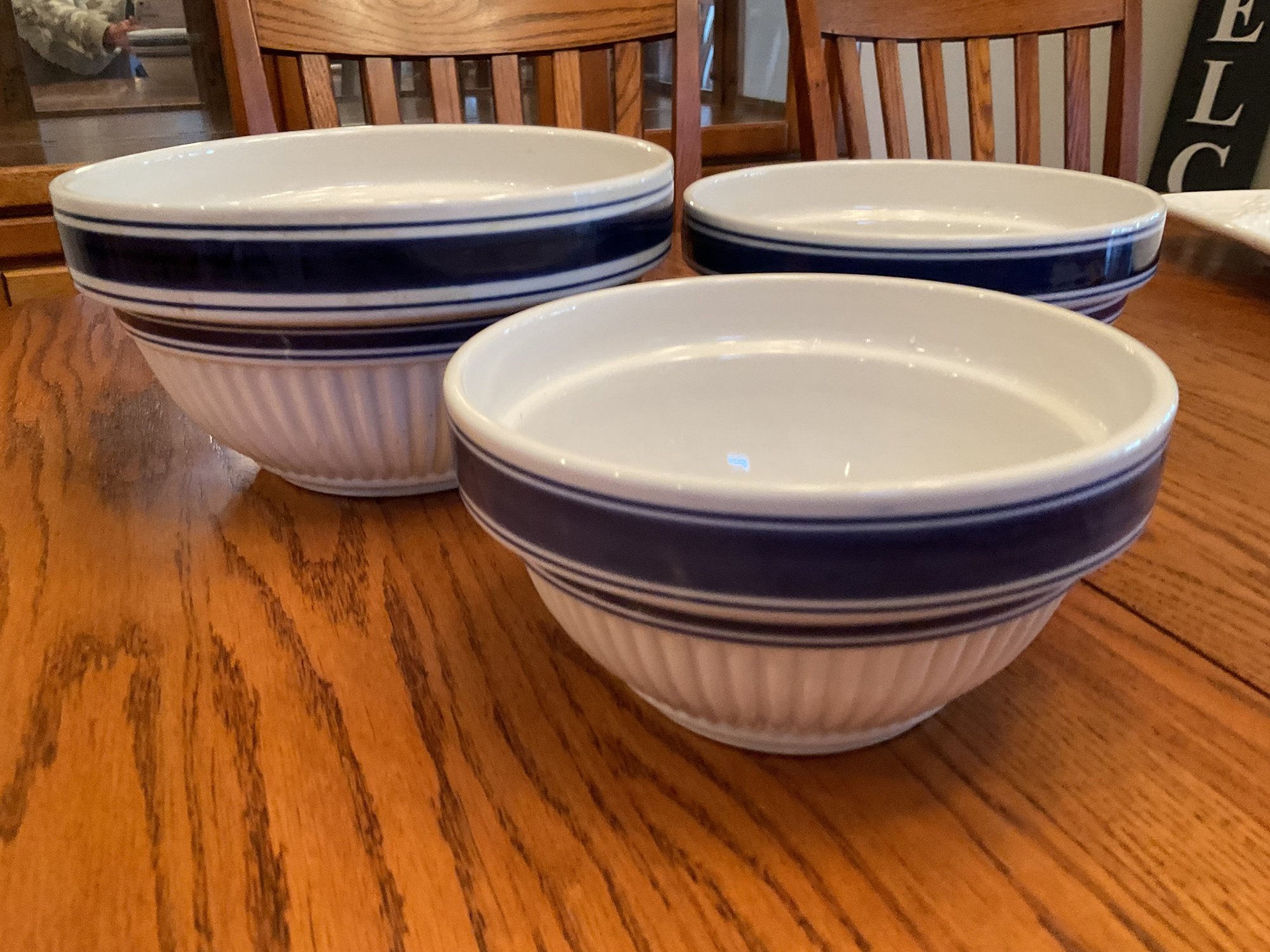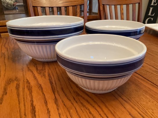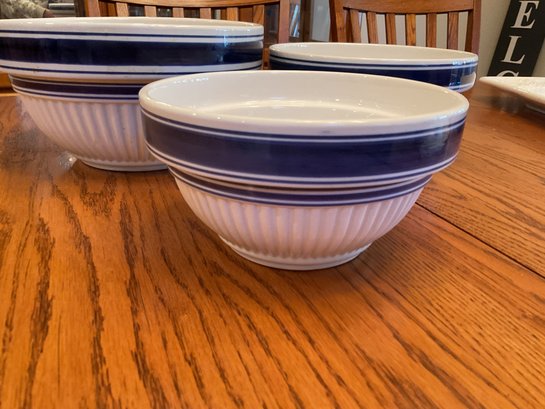 Set of 3 Nesting Bowls: Ribbed white ceramic with navy blue trim; microwave and dishwasher safe.