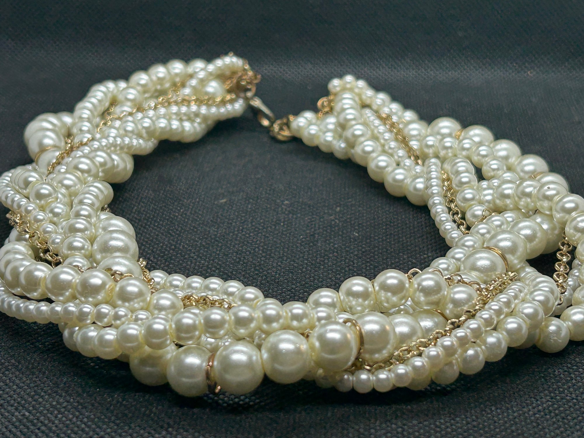 A striking design, with faux pearls interlaced with gold-tone chains in a woven braid. Condition is very good.