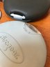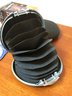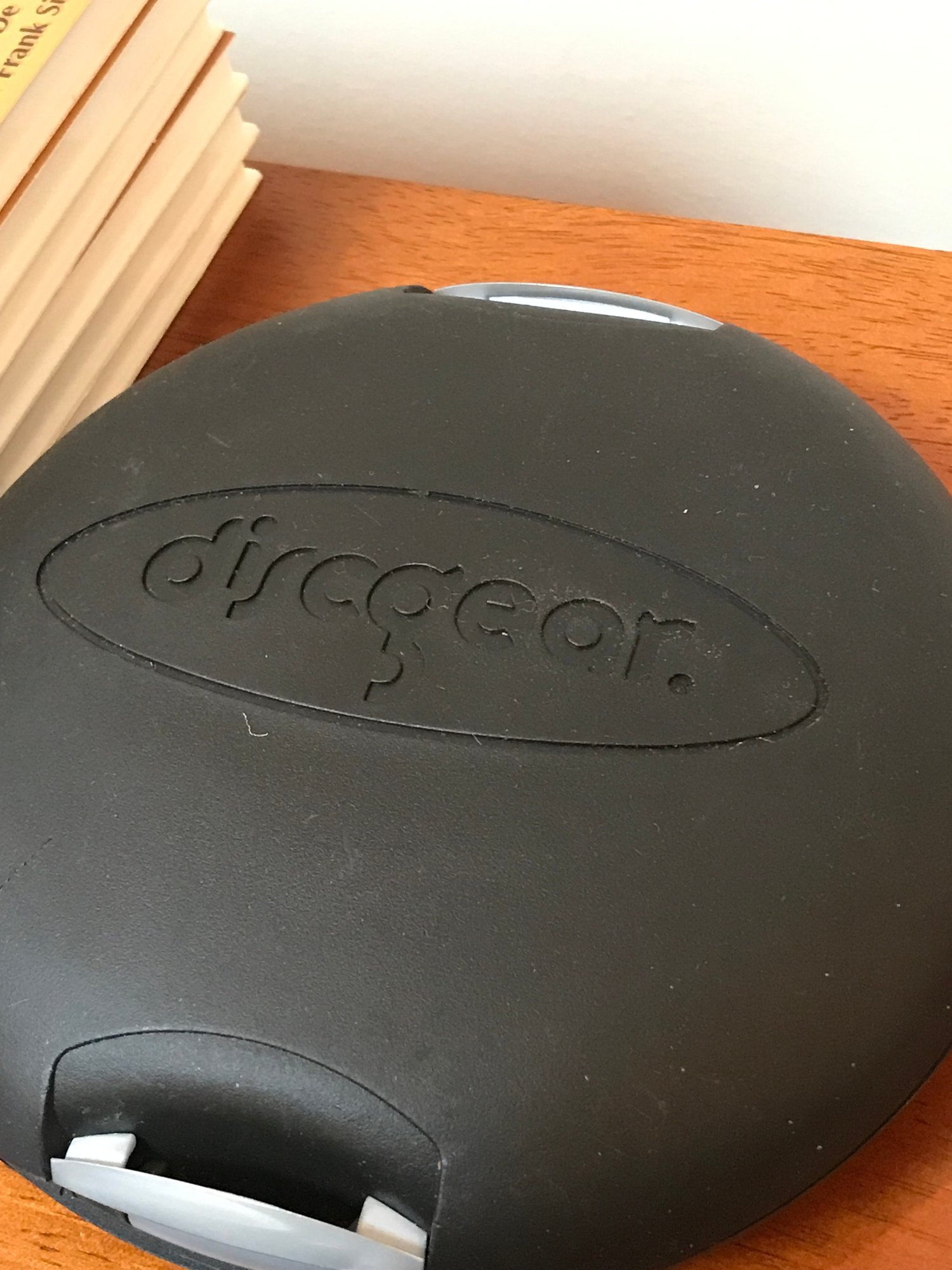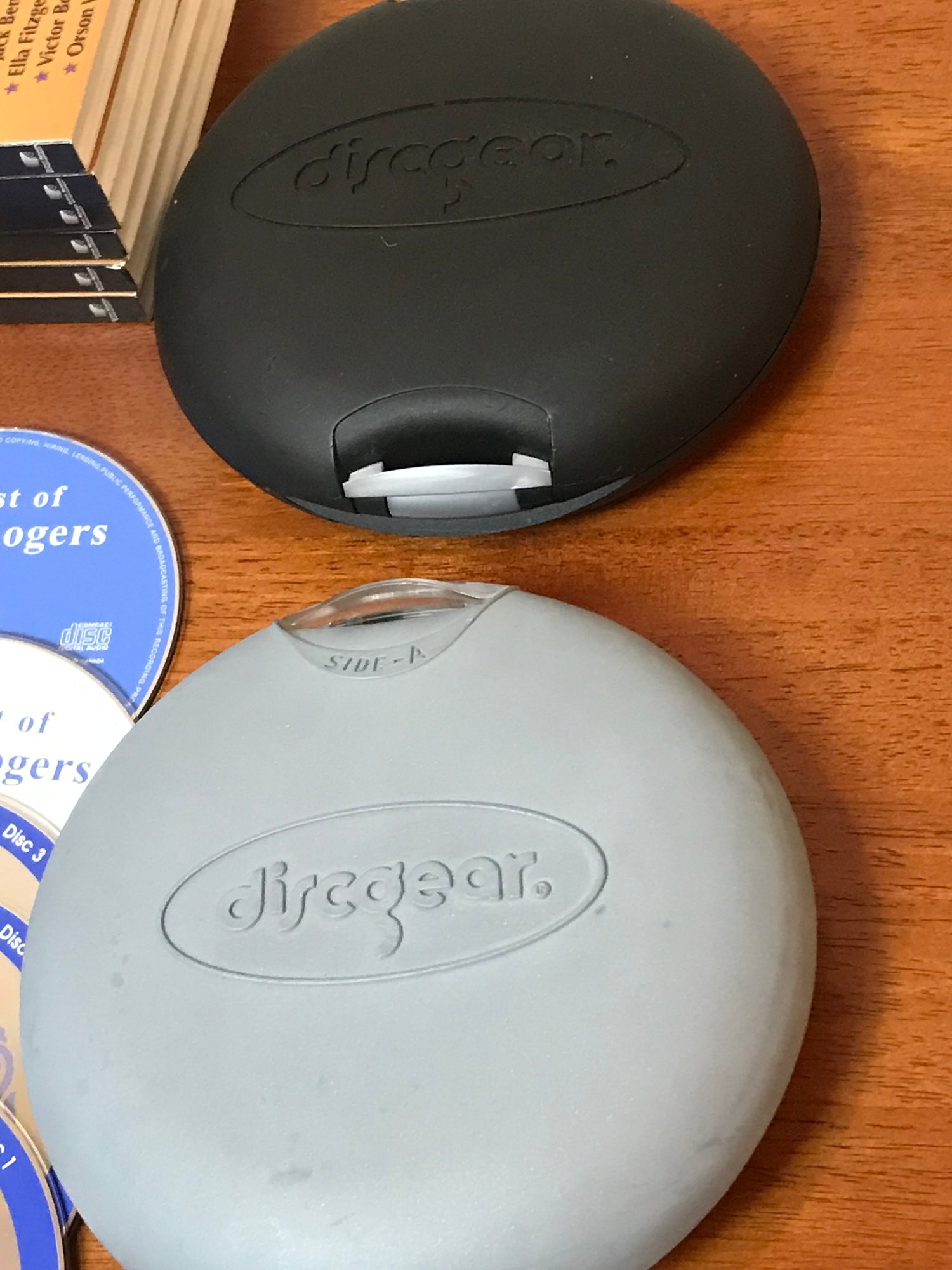 DiscGear Portable Storage: Two "DiscGear" protective hardshell cases (one black, one grey) with internal accordion-style sleeves for organized, space-saving disc storage.