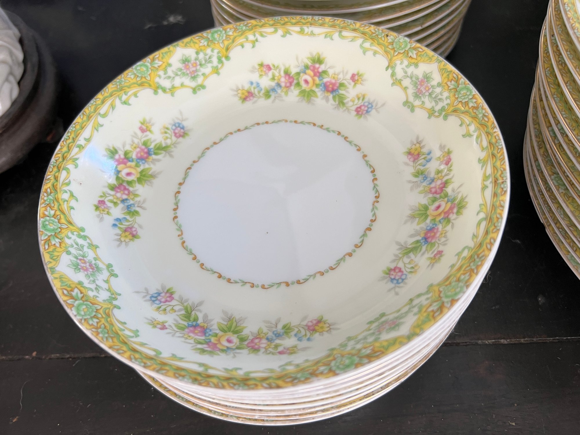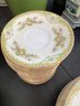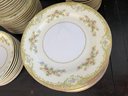 Fine Japanese Noritake porcelain dinnerware set in a floral pattern on a cream-yellow tone with pink, blue, yellow and green floral and swag designs. Eleven 10" dinner plates, eight soup bowls, eleven 6.5" bread plates, twelve 7.5" dessert plates, and twenty 5.5" saucers.
