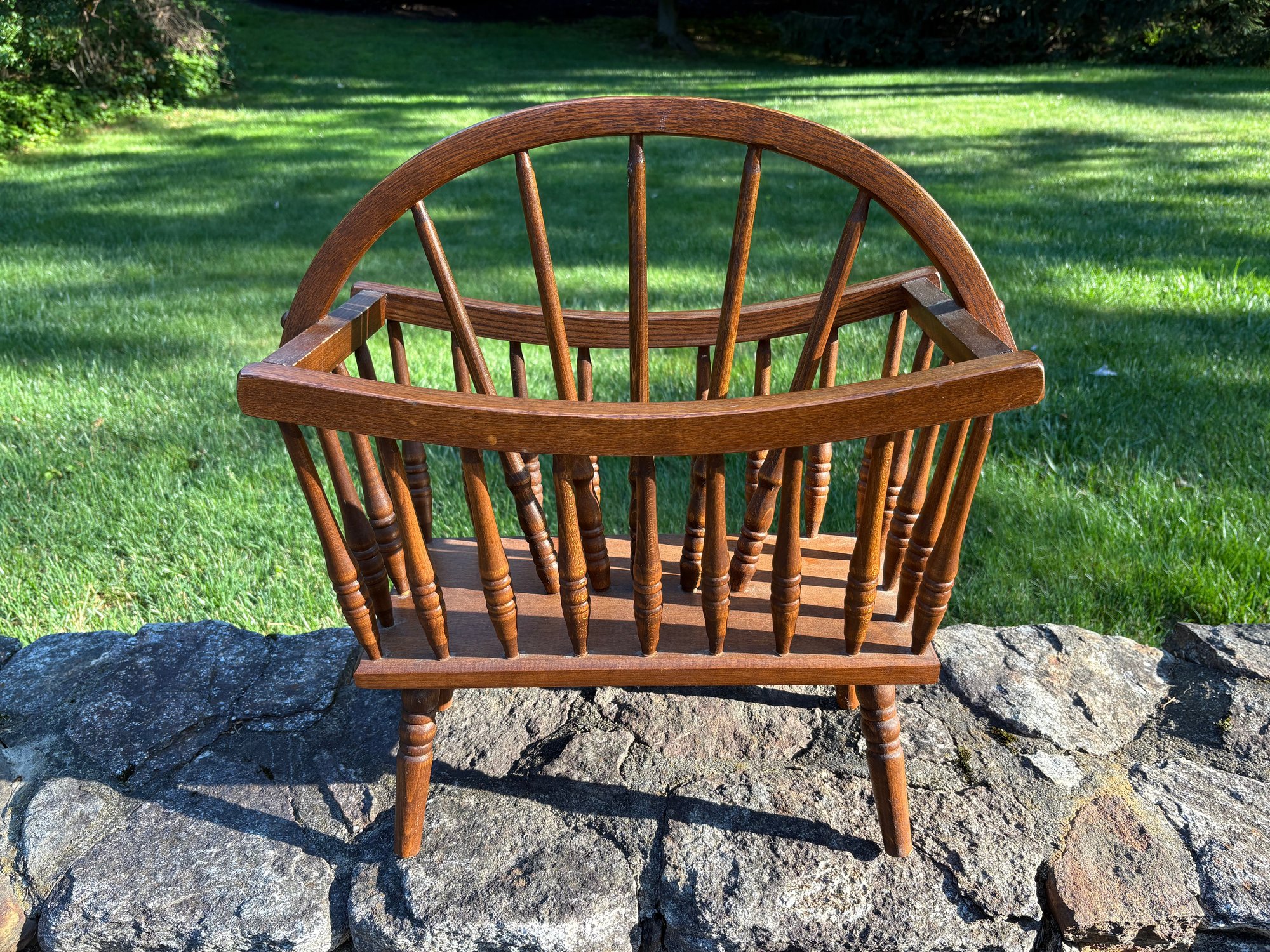 Vintage oak spindle designed magazine rack with bentwood handle.