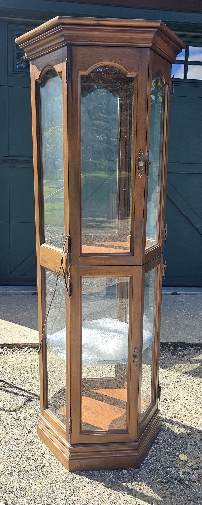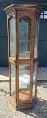 This exquisite vintage octagonal curio cabinet is a stunning addition to any home decor. Standing at an impressive approximately 6 feet tall and measuring 24.5 inches across, this piece offers ample display space for your treasured collectibles. The cabinet is divided into two sections, each featuring double doors with glass panels, allowing for a clear view of the contents inside.