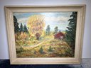 Vintage original small framed landscape painting in a slightly naive style featuring a red cabin in an autumn landscape, perhaps a Canadian scene if the frame shop is any indication of its origin. Signed E.K. in the lower right and there appears to possibly be a date may be '47 but it is partially obscured by the frame.