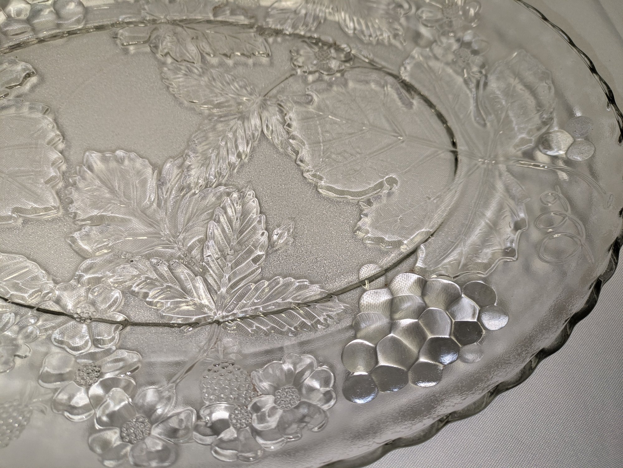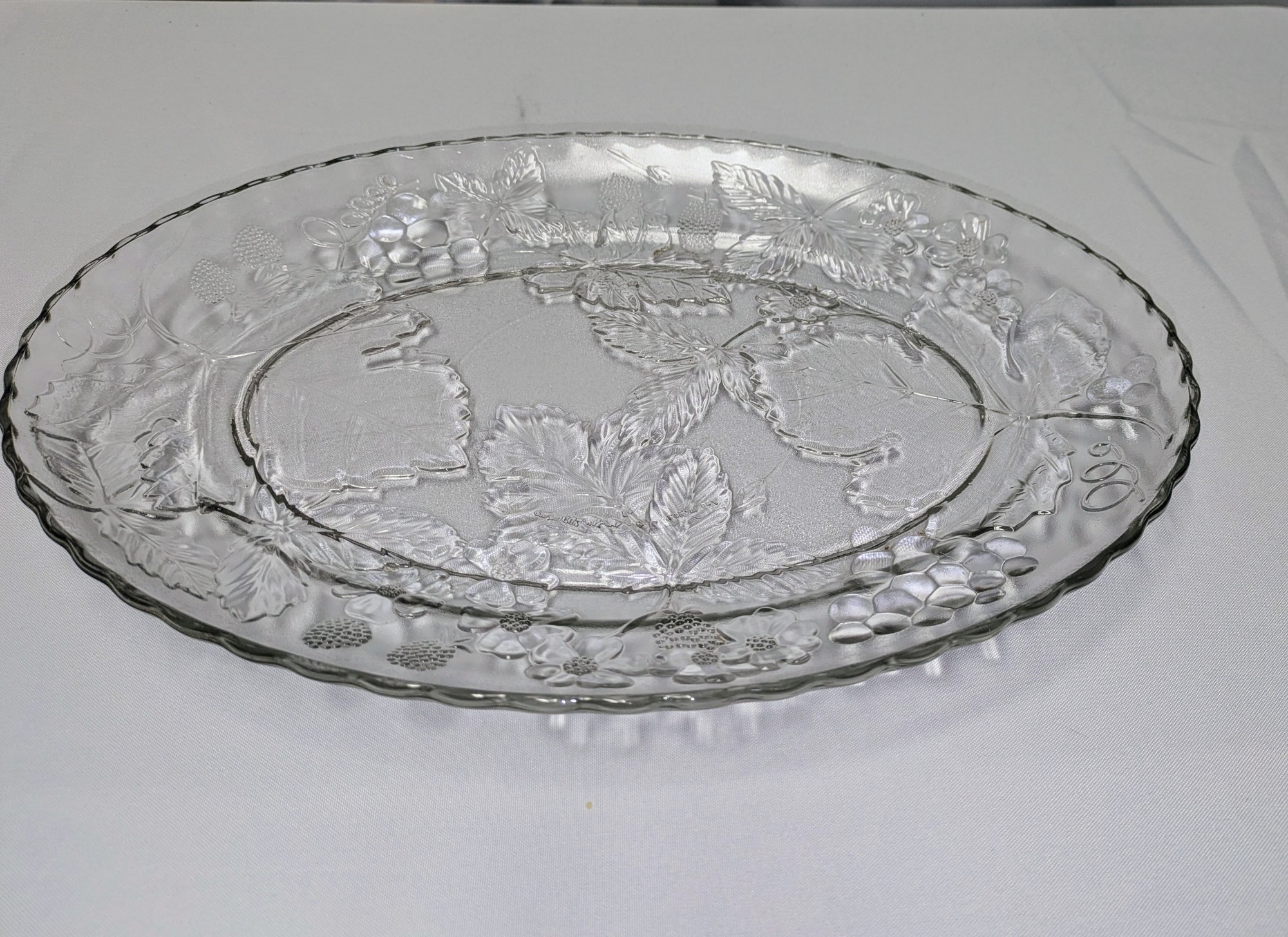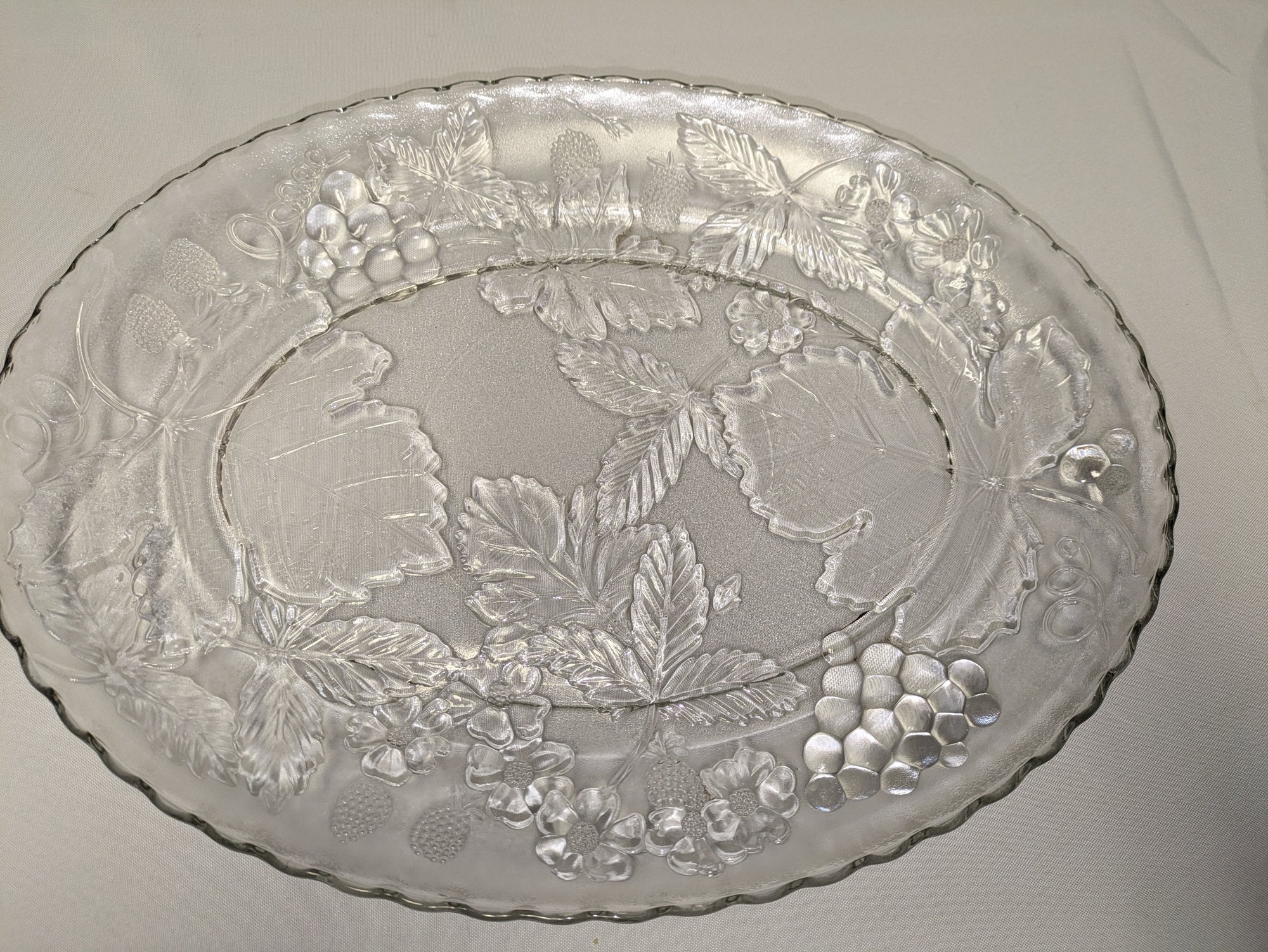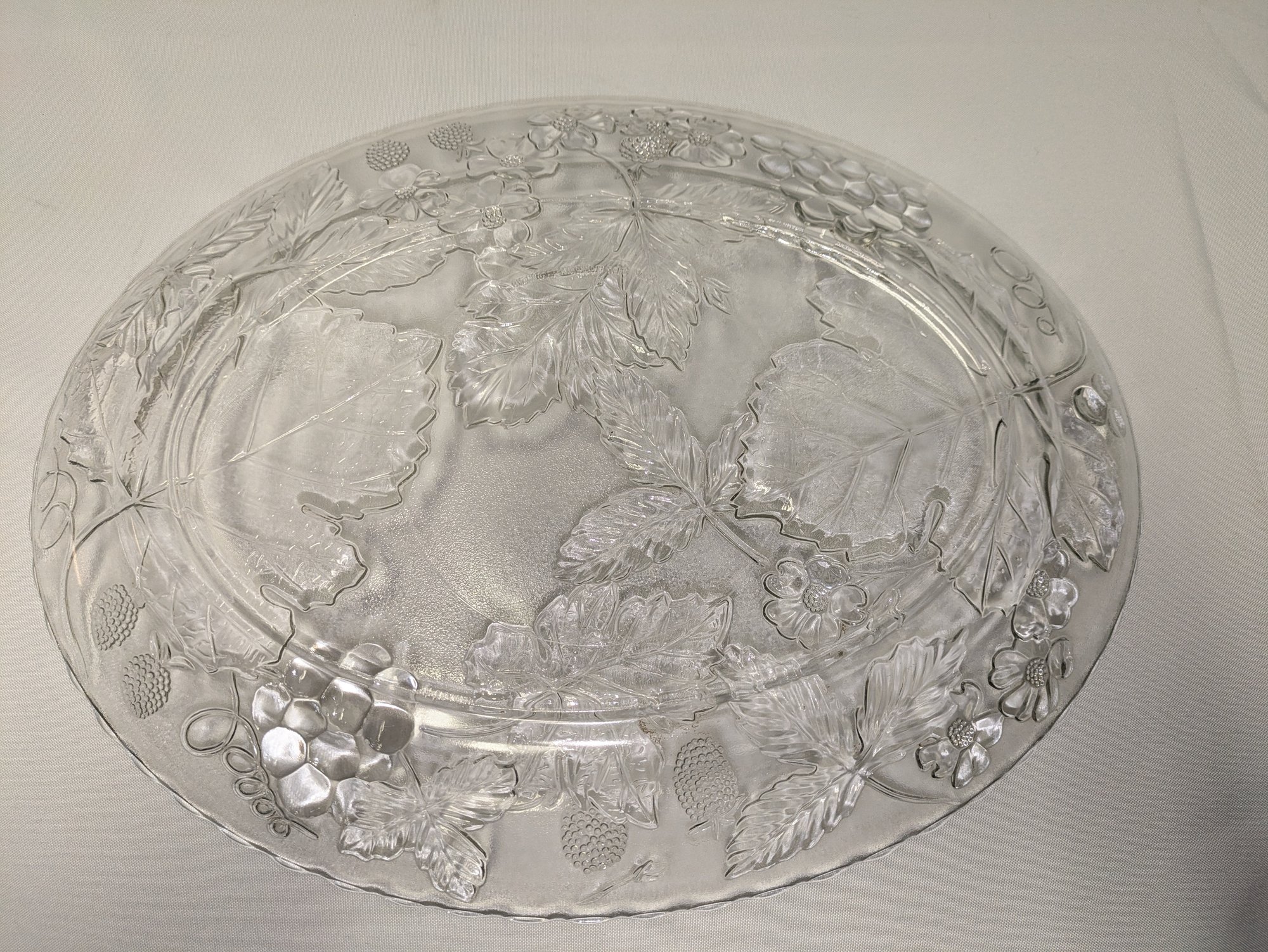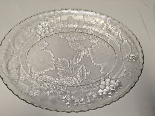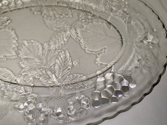 Features a beautiful grape and leaf pressed glass detailed design. Excellent Vintage Condition. Please see all photos as part of the description and condition. 1.5"H x 13.5" x 18"
