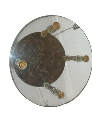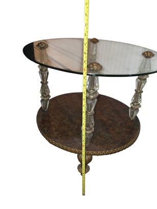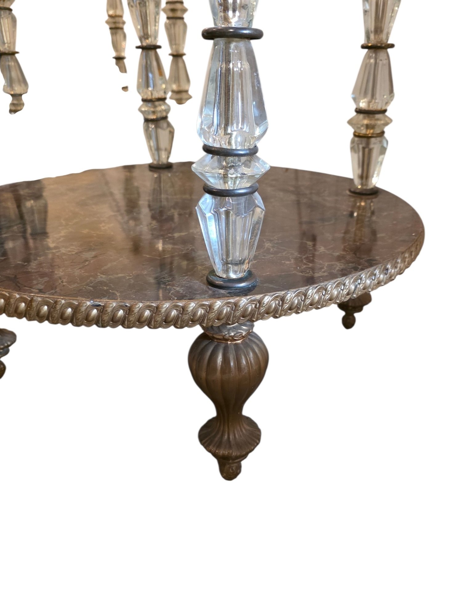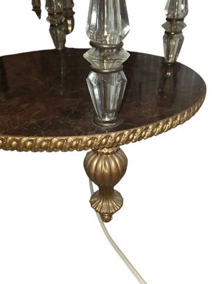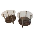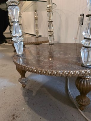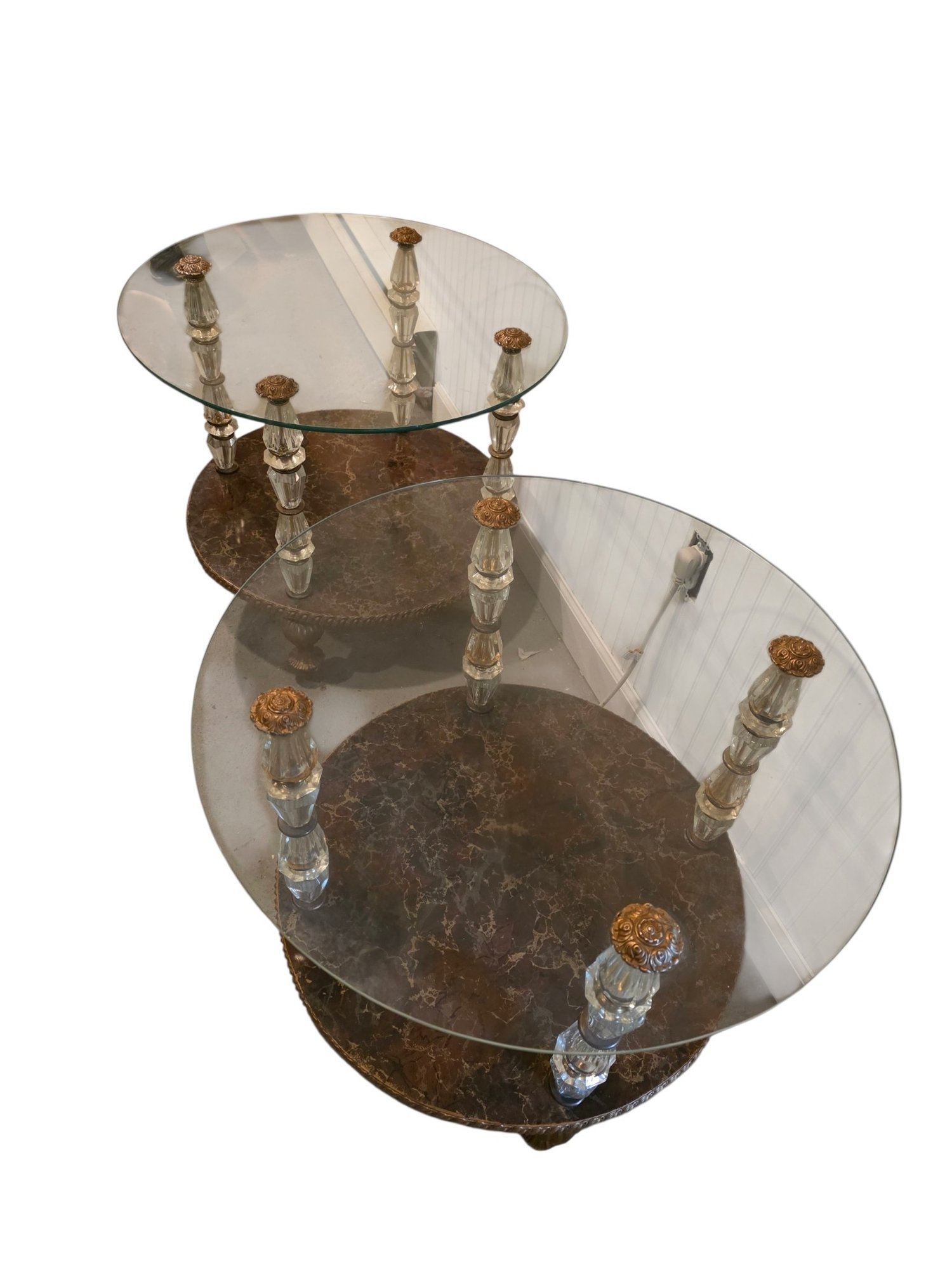 Vintage Pair of Hollywood Regency Style End Tables. Brass, Glass and Faux Marble. Crystal Like Support Columns. Two Tier Design.