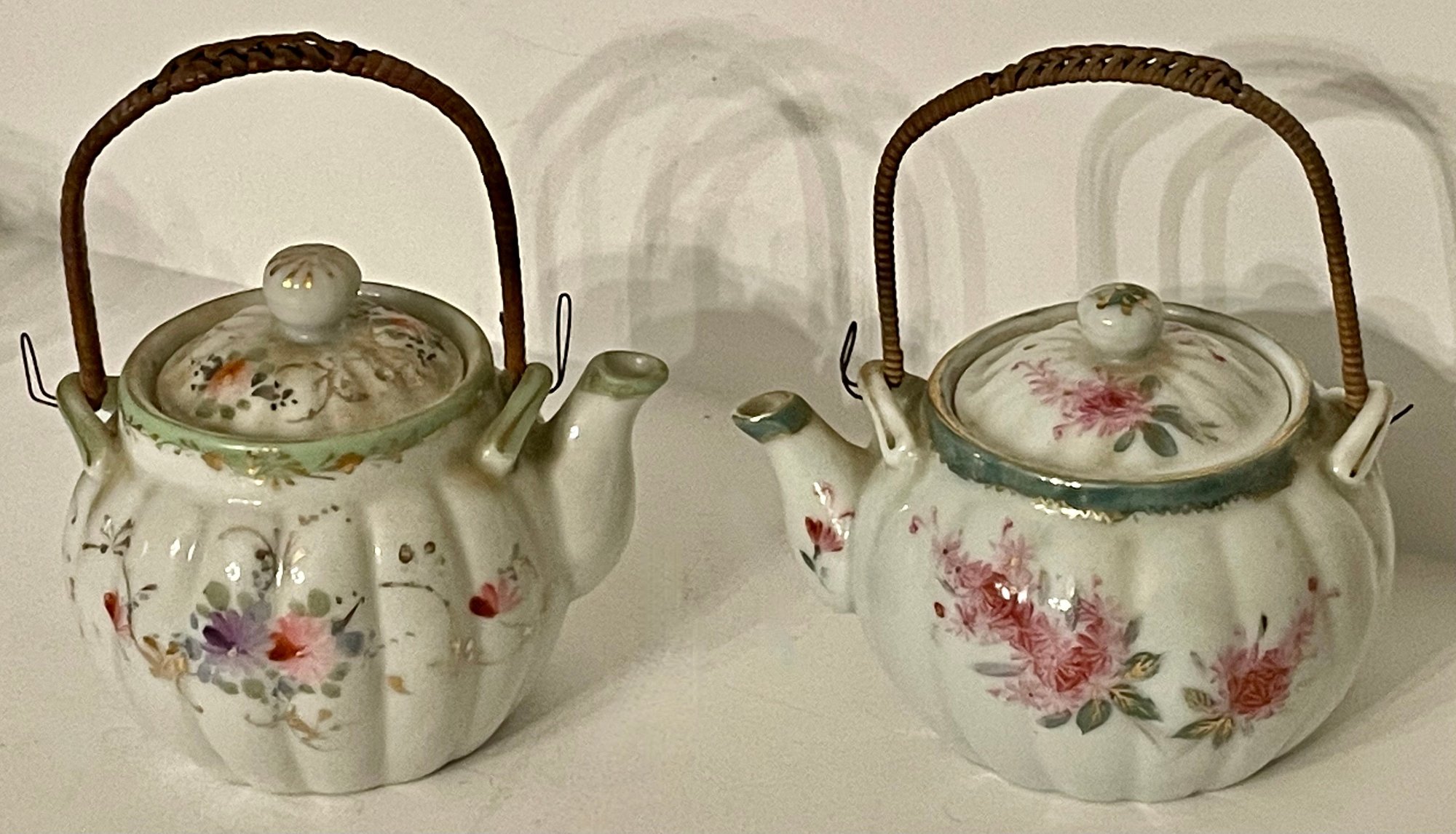 Very pretty mini tea pots from a child's tea set many years ago. They are hand painted ceramic with great handles. In good condition - just note tiny chip on inside rim - see last photo.