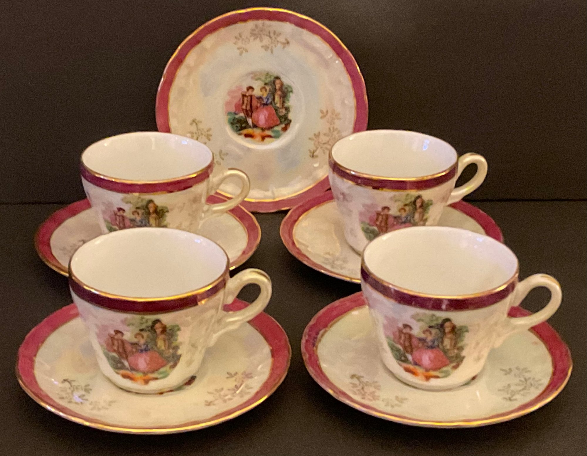 Vintage Pastoral Medallion Scene, 4 Demi Tasse Cups & Saucers.