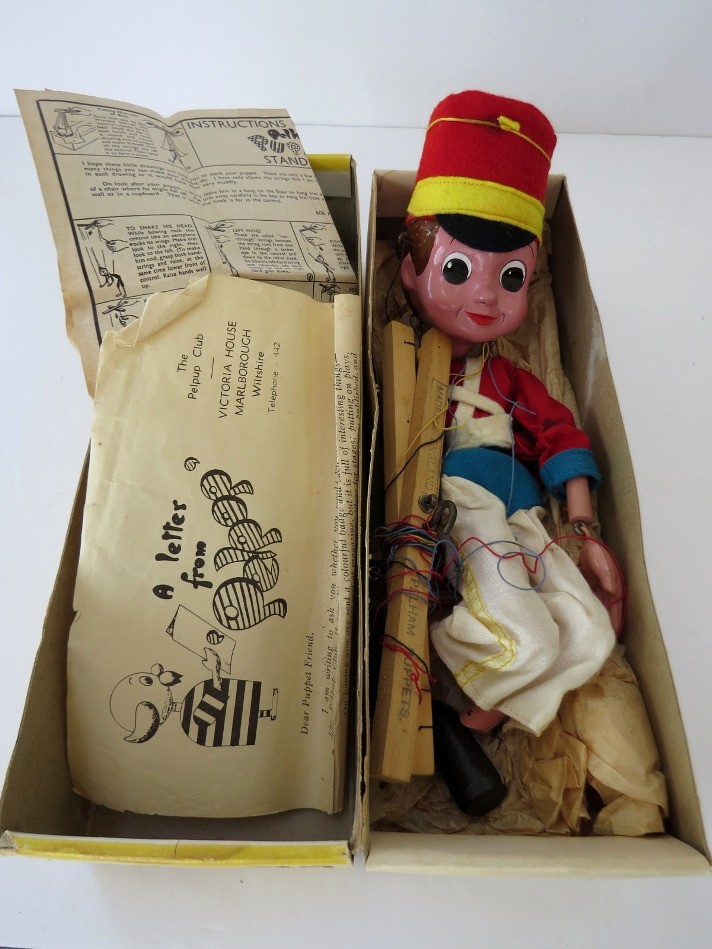 Made in England, this Pelham marionette puppet is titled "Bellhop Bell Boy" and was hand crafted for children. The puppet has original control bar and is dressed in a Bell Boy uniform. Some wrinkles from storage and light staining on uniform but no tears. Puppet measures 14" tall, not including strings/control bar. Strings are twisted but intact. Directions explain step by step how to untangle them. Includes box, illustrated directions, advertising letter and puppet.