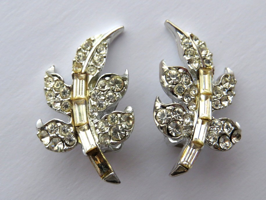 Marked Pell this pair of vintage clear rhinestone clip-on earrings are set in a silver tone setting. Crafted in a leaf design, these earrings feature clear rhinestones in round and baguette cuts. Pell jewelry originated in the 1940's in NYC, USA. There is 1 baguette missing from this pair which can easily be replaced. Earrings measure 1 1/4" in length.