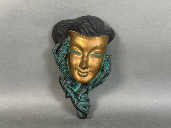 A beautiful gilded achatite wall mask of a fine lady in green fishnet gloves, designed in the late 40s or early 50s by sculptor Peter Ludwig for Achatit Werkstätten, one of the major producers in the 1950s and 1960s of the wildly popular wall masks, sculptures, and plaques that decorated so many modern homes of the era.