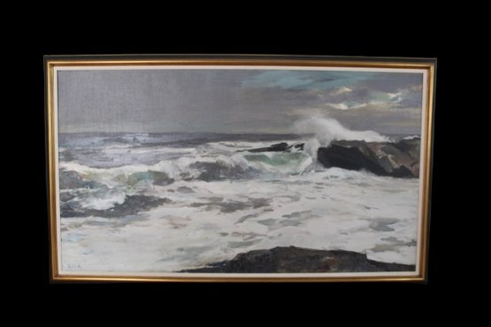 Seascape, beautiful thick distressed gold wood frame with black accents