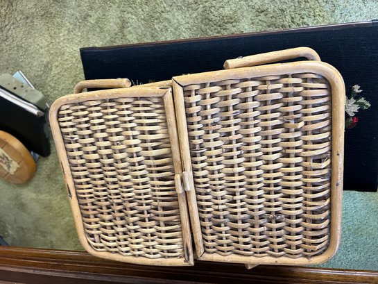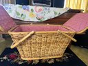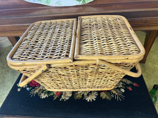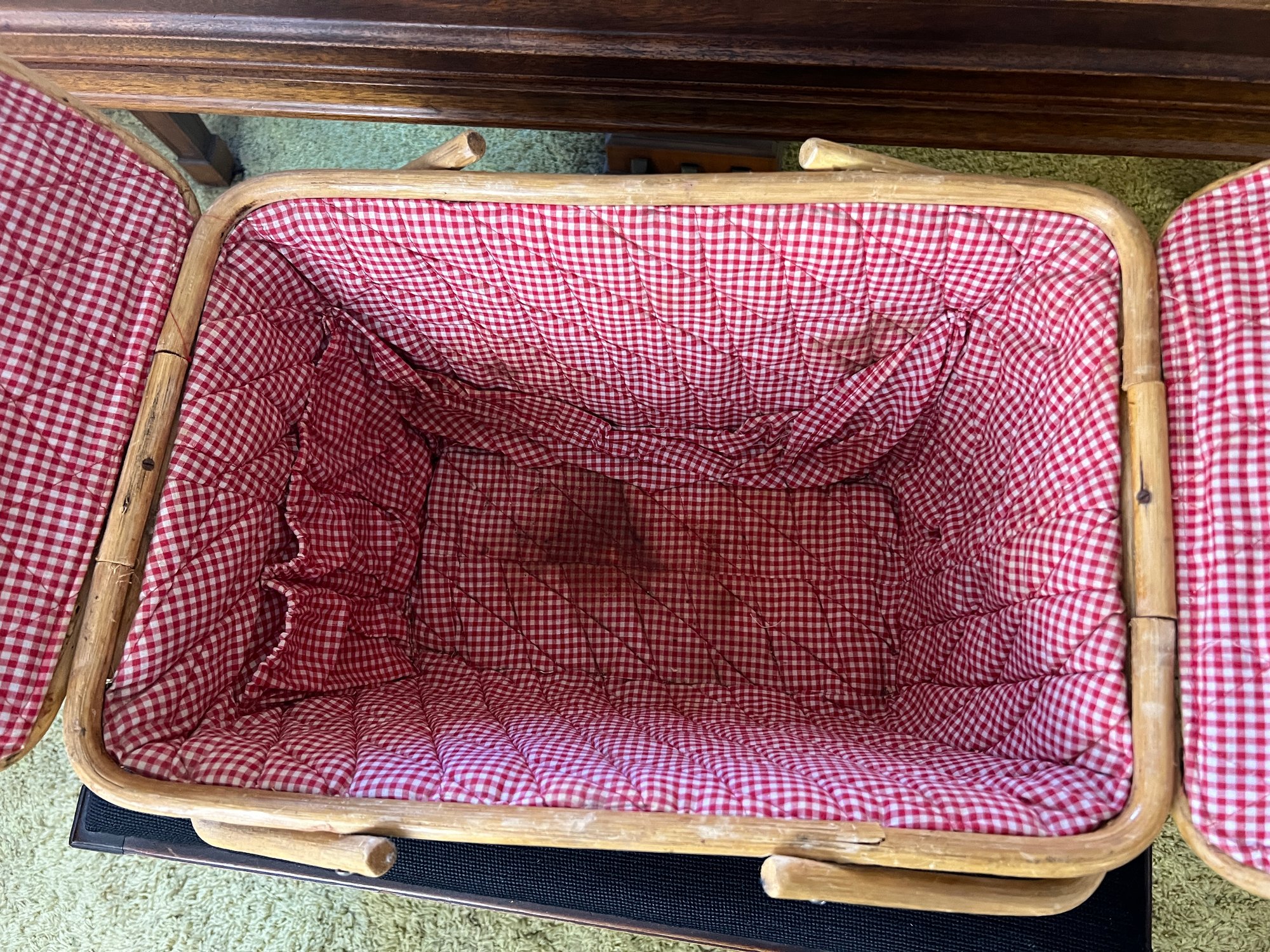 Vintage picnic basket with the classic split lid that opens from the middle with two handles and a red and white check lining.