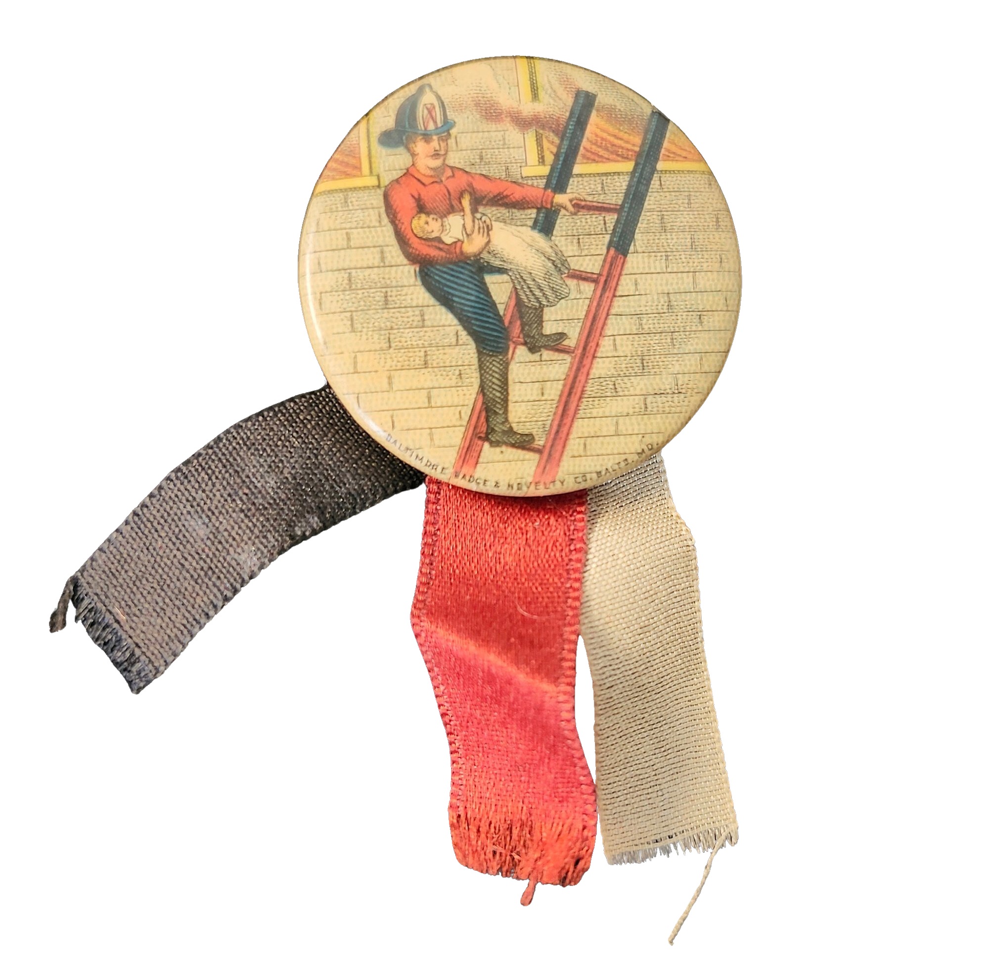 Great antique celluloid over tin pinback with illustration of a fireman on a ladder saving the baby. Marked on front Baltimore Badge & Novelty Co. and on the reverse W.F. Miller Park Row New York City. Red white and blue silk ribbon attached. The pinback itself measures 1.25” across.