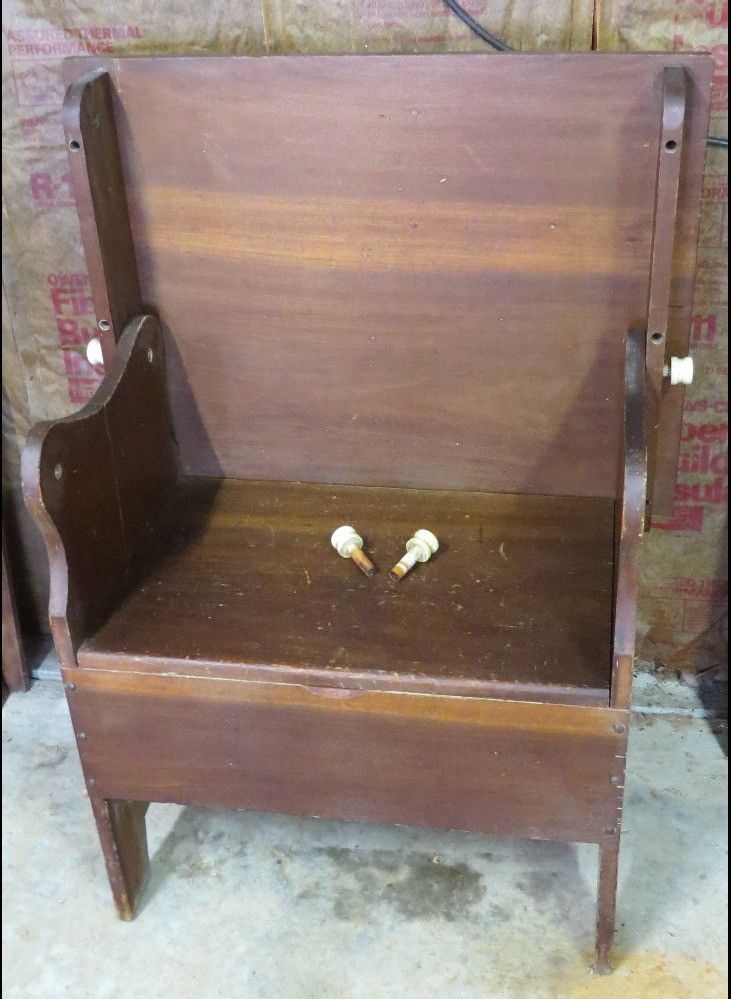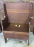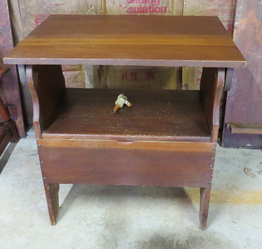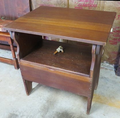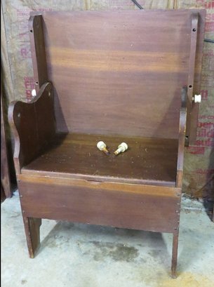 This is a home-built pine settle or hutch table, c.1970's creation. Measures 30.5" wide, 23.5" depth, 29.5" height. All 4 pegs present, two act as the hinge for a seat, all four secure the top in place. Flip up storage seat underneath.