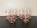 Set of six vintage pink and mauve striped glasses, four tall and two short.