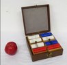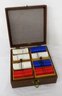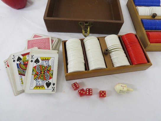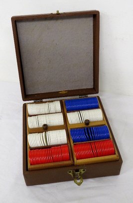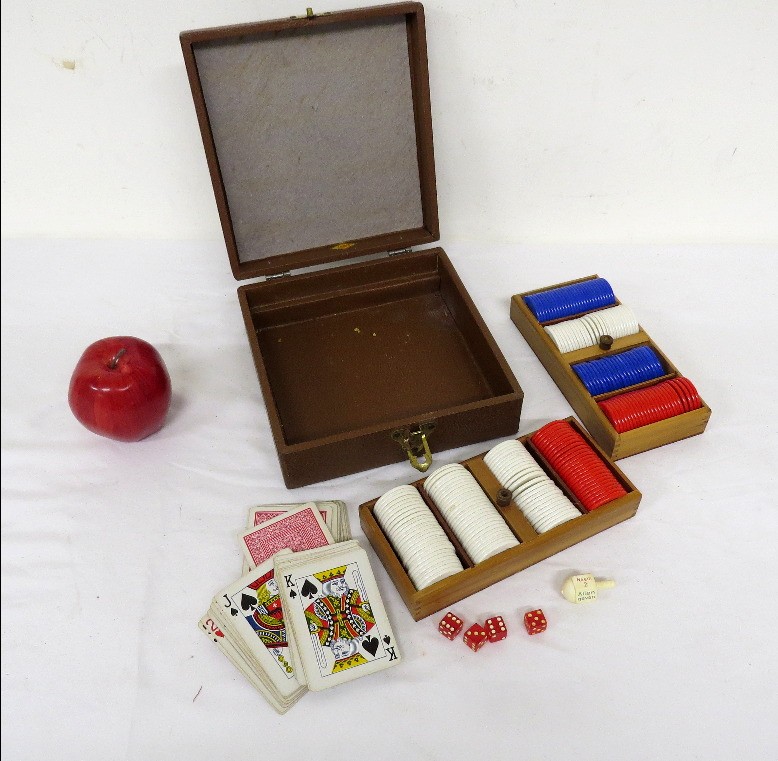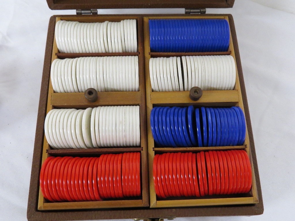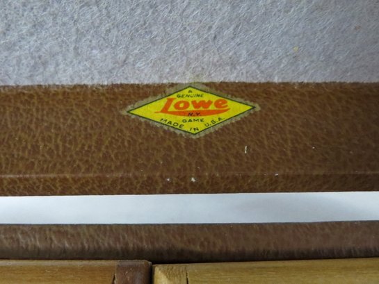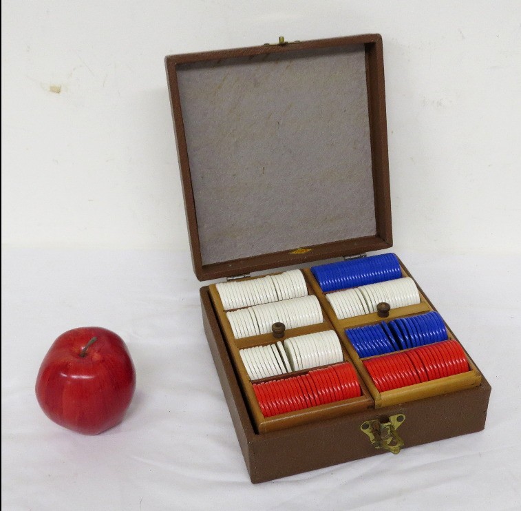 Vintage Lowe Gaming Case with Poker Chips on raised rail with space underneath for a deck of cards, dice and more.