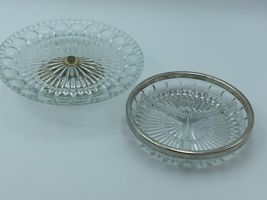 Two pretty matched antique serving pieces of pressed glass. The bowl has 3 sections and a (possibly) silver-plate rim, the canape stand has a (possibly) silver-plate foot. Both show tarnish and signs of age but some cleaning and care will make these shine. Maker unknown