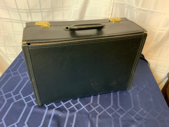 This is a vintage black leather file case. Has double Presto locks and top opening with inner dividers to hold files upright. This in in excellent vintage condition, needs some dusting and vacuum out but no damage found. Handle has scuffs from age and use but is solid and secure. No key, replacements available online.