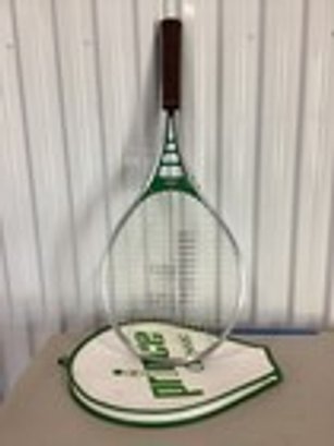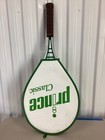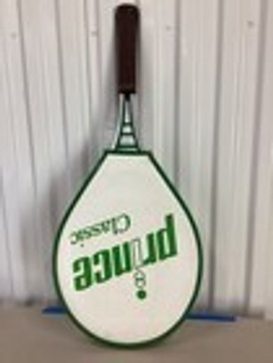 Vintage Prince Classic tennis racket featuring the iconic oversized head design that helped revolutionize the game. This racket is marked as strung at approximately 72 lb tension and reflects the innovation and performance focus Prince became known for. The frame shows age-appropriate wear consistent with use while maintaining its classic appeal. Ideal for collectors, tennis enthusiasts, or as a nostalgic display piece for a home, office, or sports-themed setting.