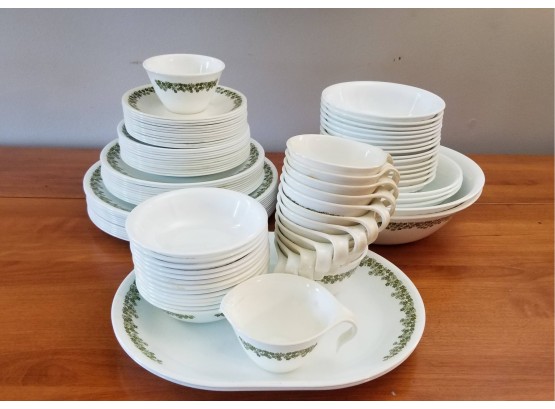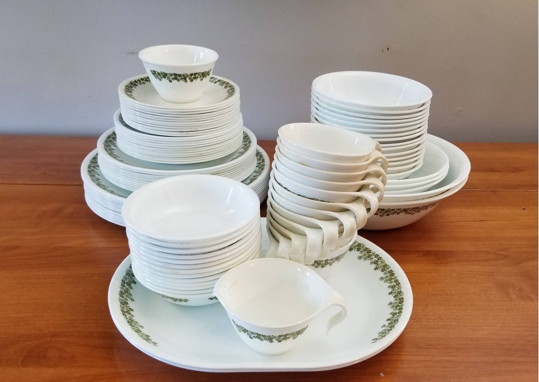 96 total pieces of Correlle Spring Blossom Green and white dinnerware.