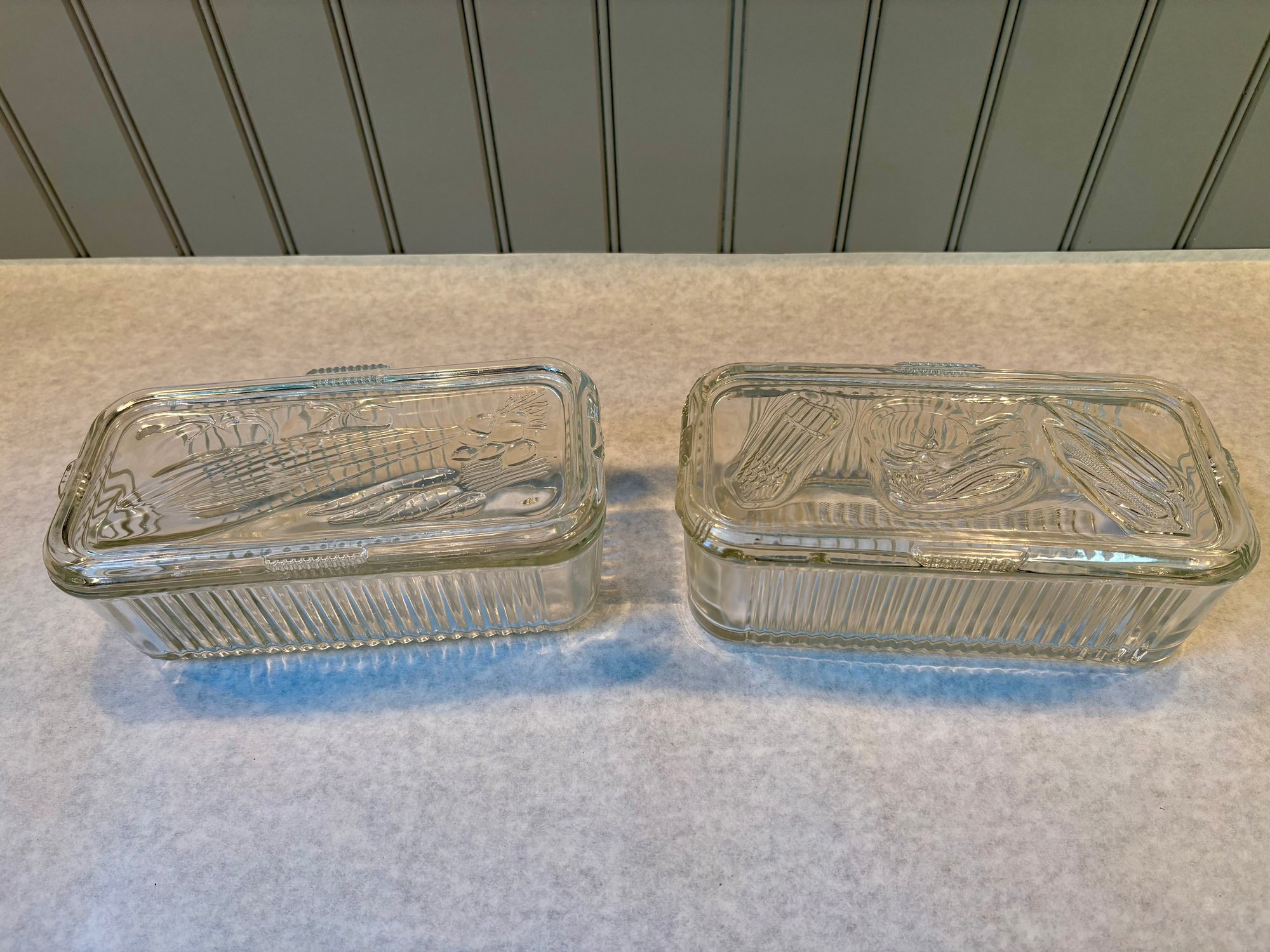 Two (2) vintage rectangular lidded glass containers each with a vegetable motif.
