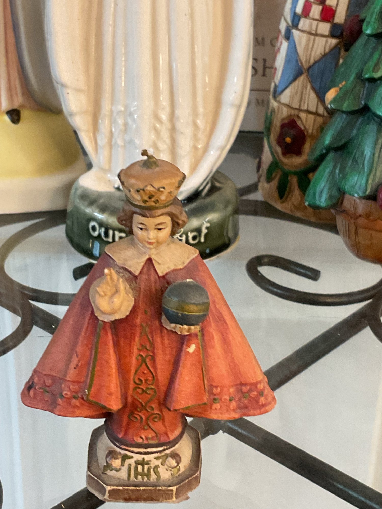 Infant Jesus of Prague: A classic polychrome resin/composite figurine in traditional red and gold vestments, holding the globus cruciger.