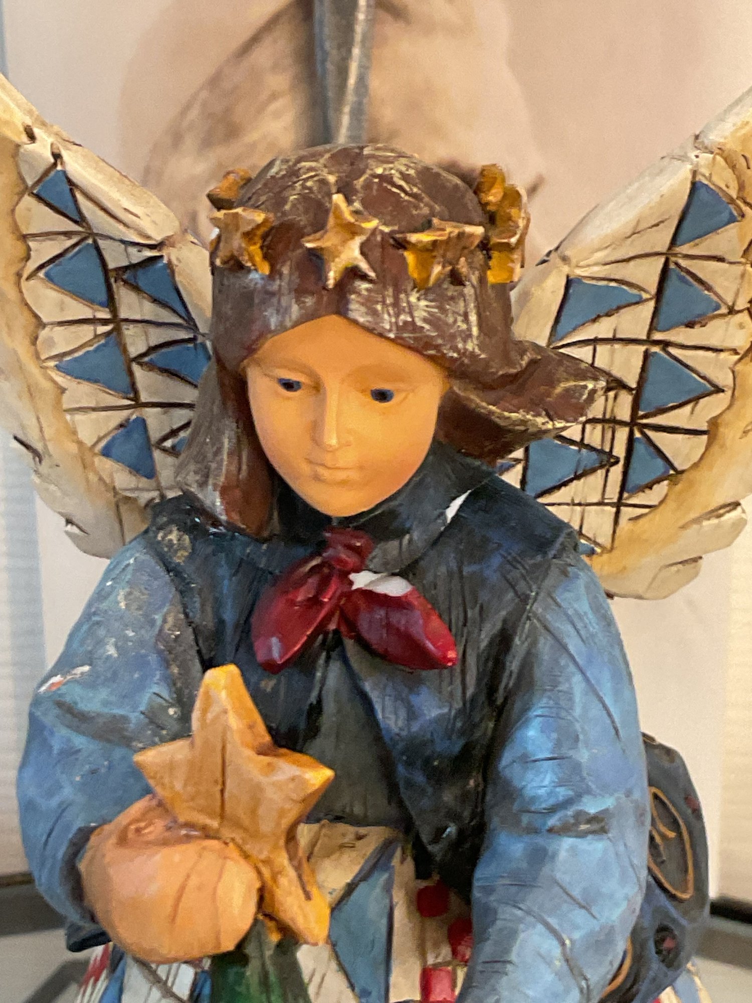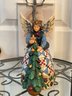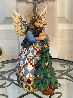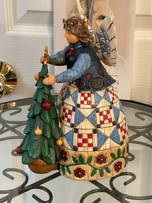 Jim Shore Heartwood Creek Angel: Titled "Angel with Christmas Tree" (B105172), dated 2002. Features Shore's signature quilt-patterned folk art style. Note: Bow is broken/damaged. Measures 8.5" H x 4" W.