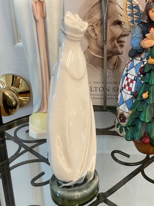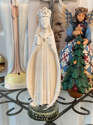 Our Lady of Knock Figurine: Authentic Knock Pottery from Ireland. Features a glazed green base. Note: Visible crazing on the back. Measures 8.25" H x 2.75" W.
