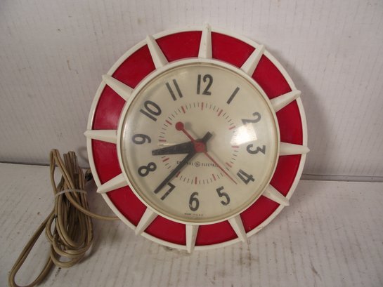 VINTAGE RETRO RED AND WHITE GENERAL ELECTRIC WALL CLOCK MODEL 2H117 TESTED WORKS. SEE PHOTOS FOR CONDITION