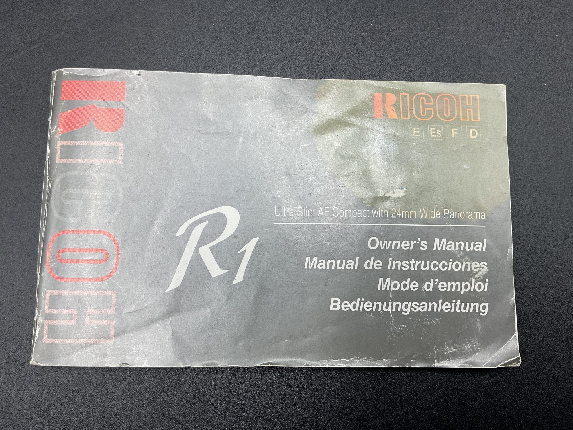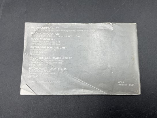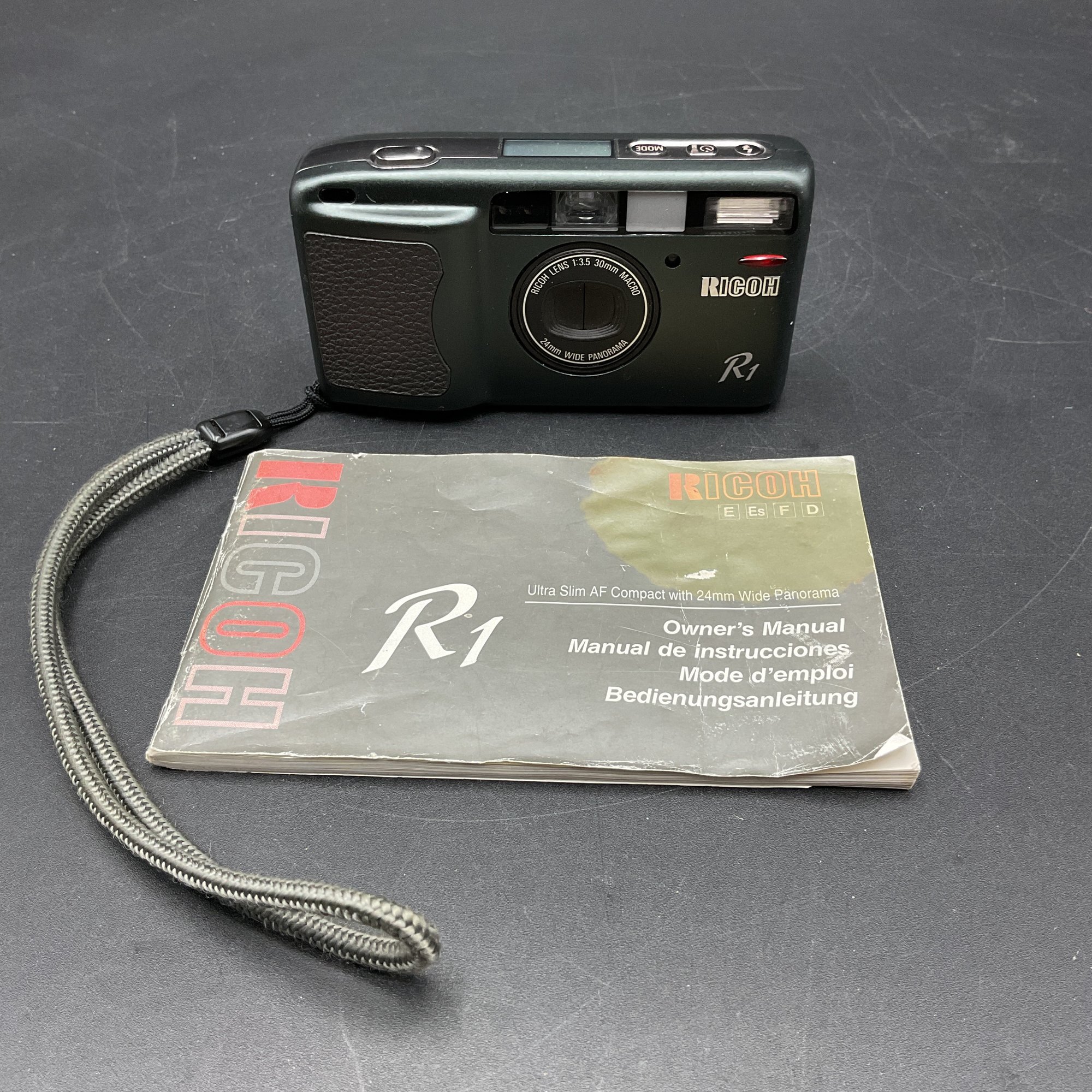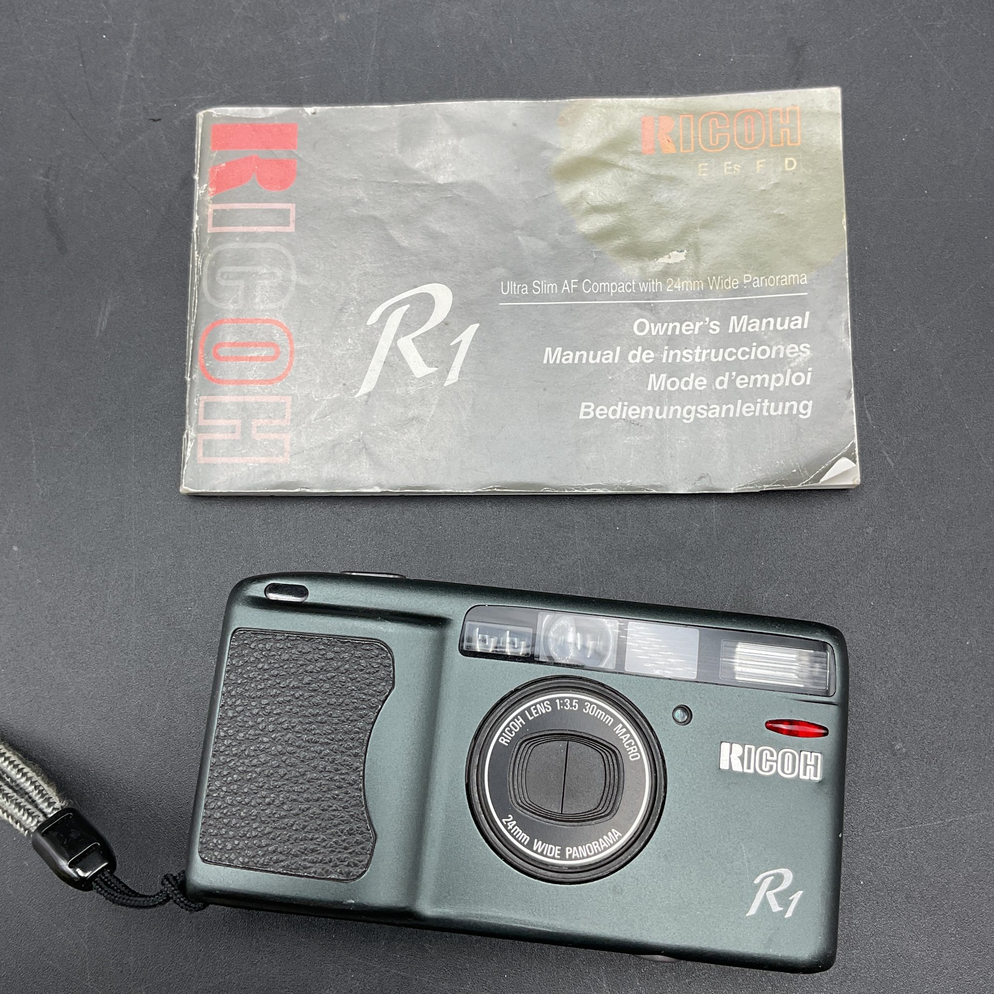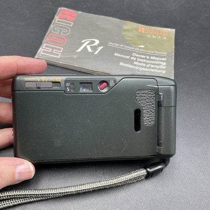 1994 Vintage RICOH Ultra-slim AF Compact camera with 24mm wide Panorama film camera. Appears to work but won't turn on/open lens cover without film loaded. Motorized film winding engages after closing the back, so we believe this works well. Includes original manual.