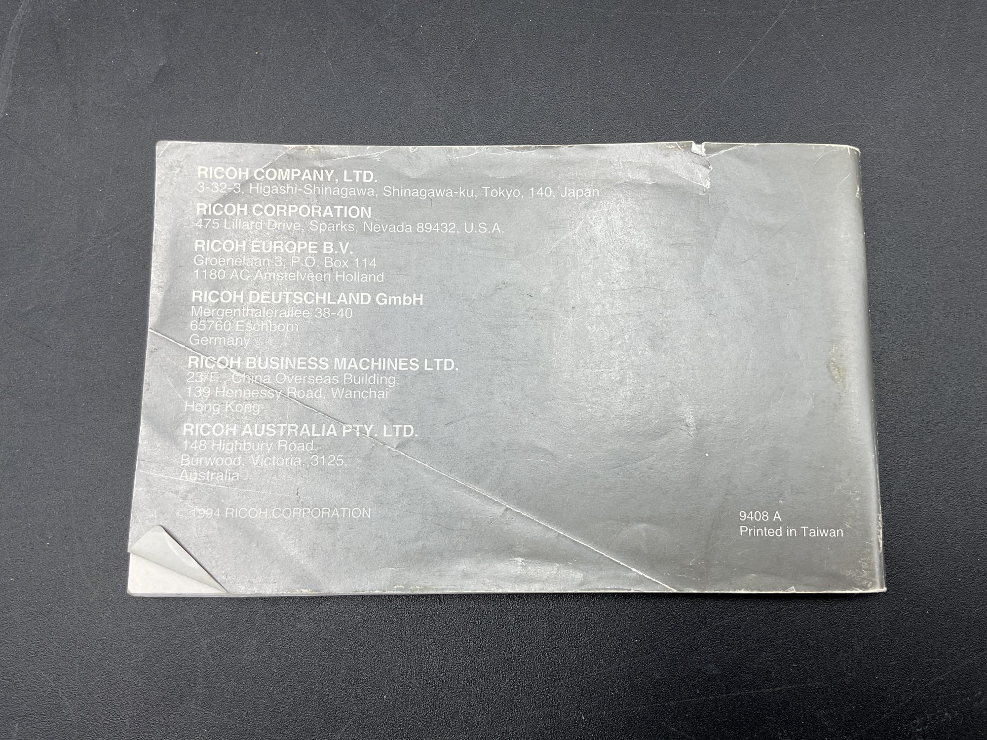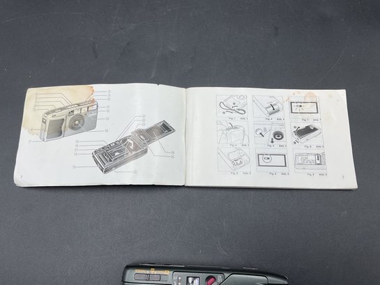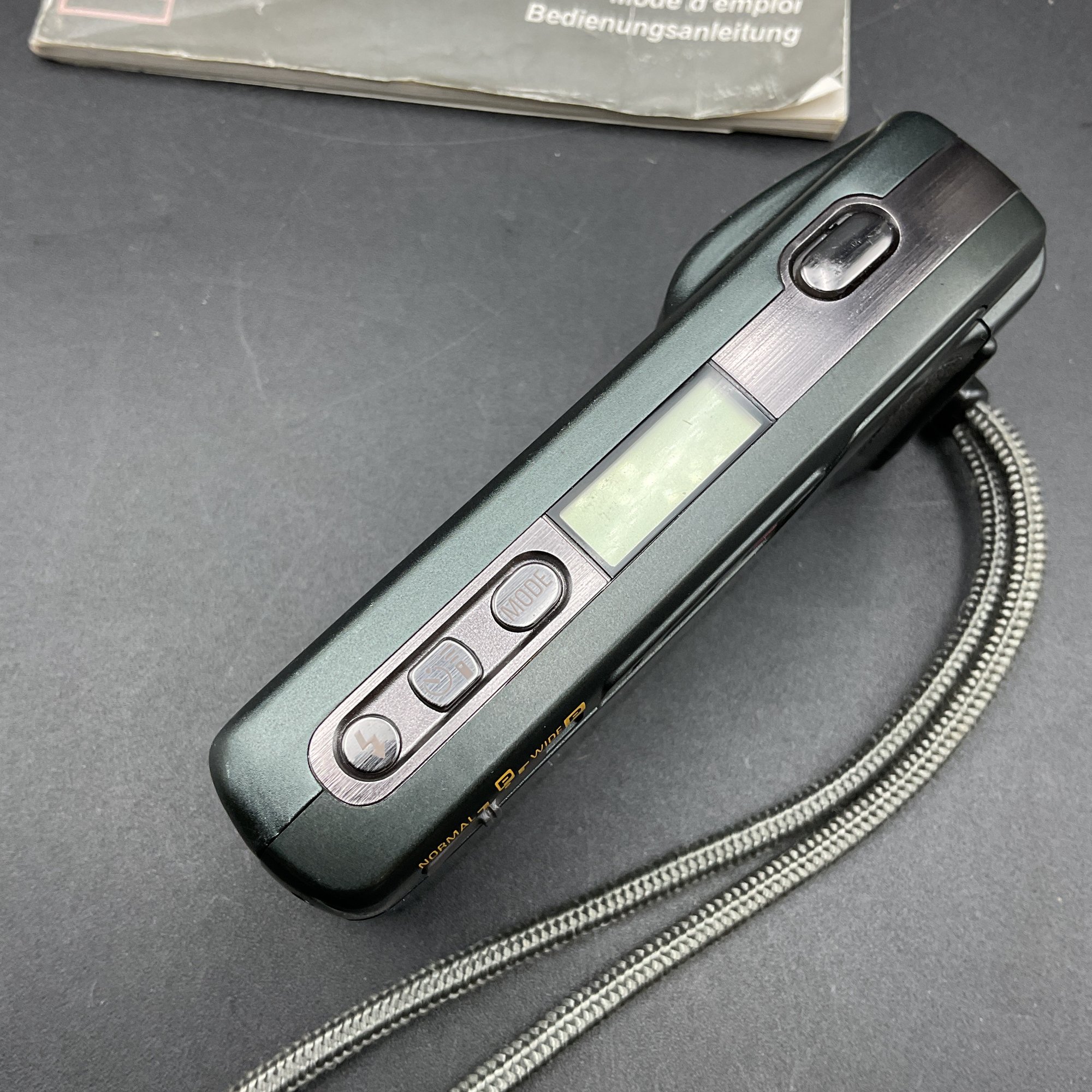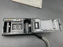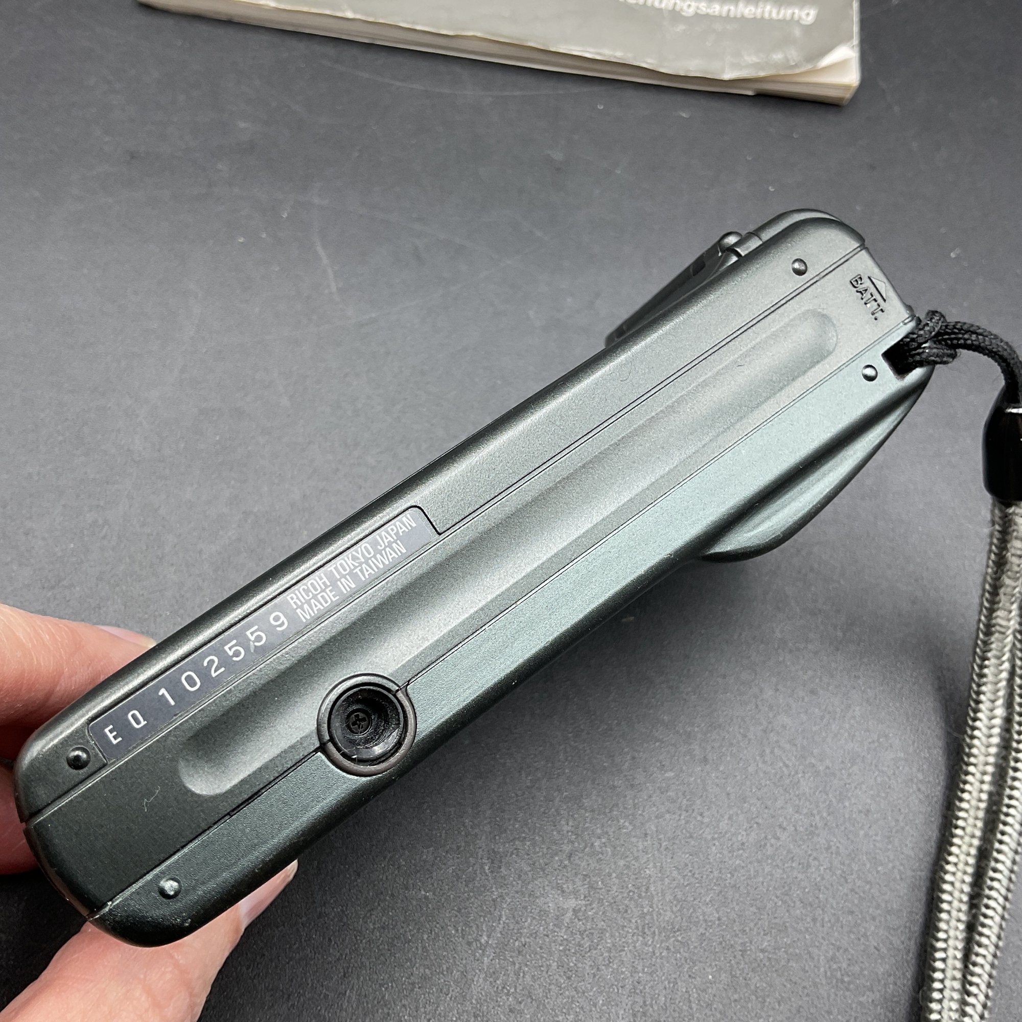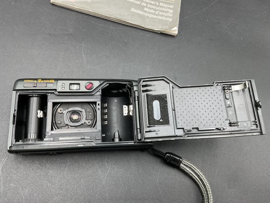 1994 Vintage RICOH Ultra-slim AF Compact camera with 24mm wide Panorama film camera. Appears to work but won't turn on/open lens cover without film loaded. Motorized film winding engages after closing the back, so we believe this works well. Includes original manual.