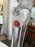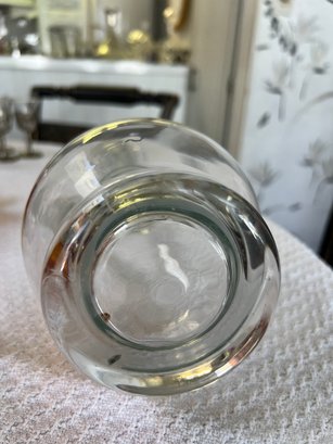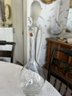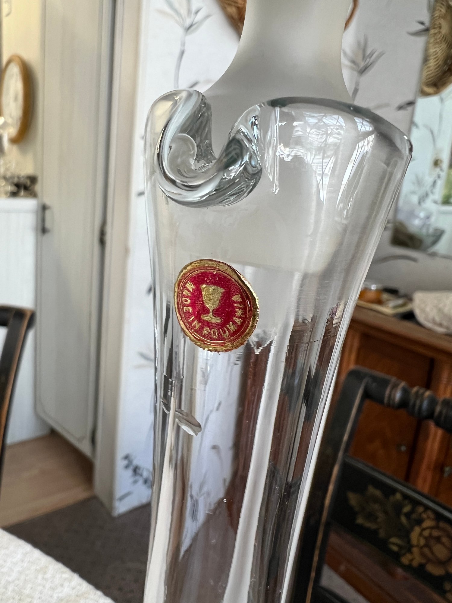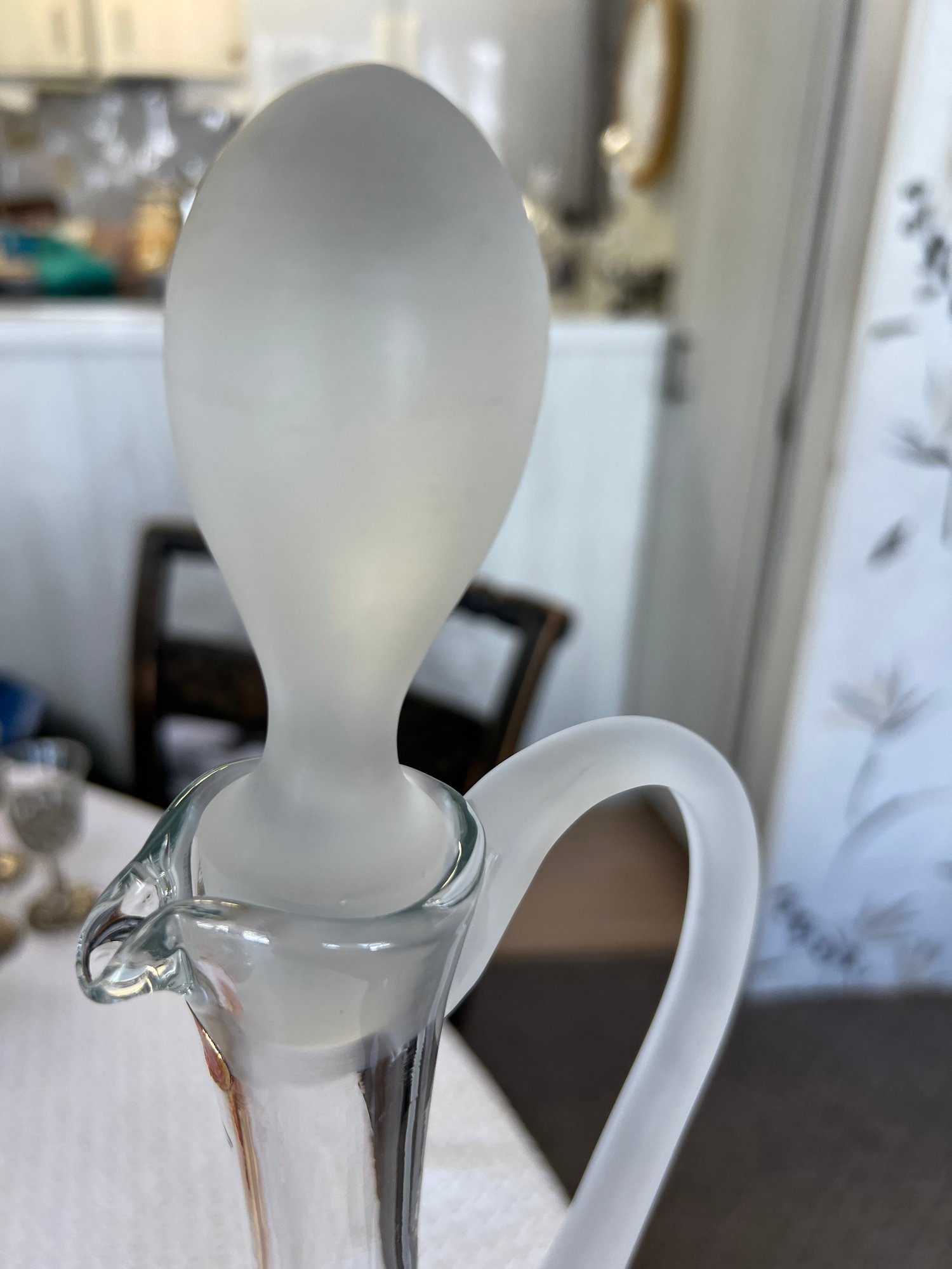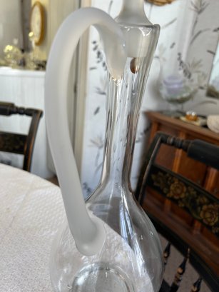 Attractive tall elongated vintage Romanian glass decanter with frosted stopper and handle.