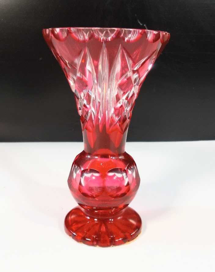 Beautiful vintage ruby cranberry red cut-to-clear footed bud vase. Cut shapes are clear with an attractive unique aesthetic.