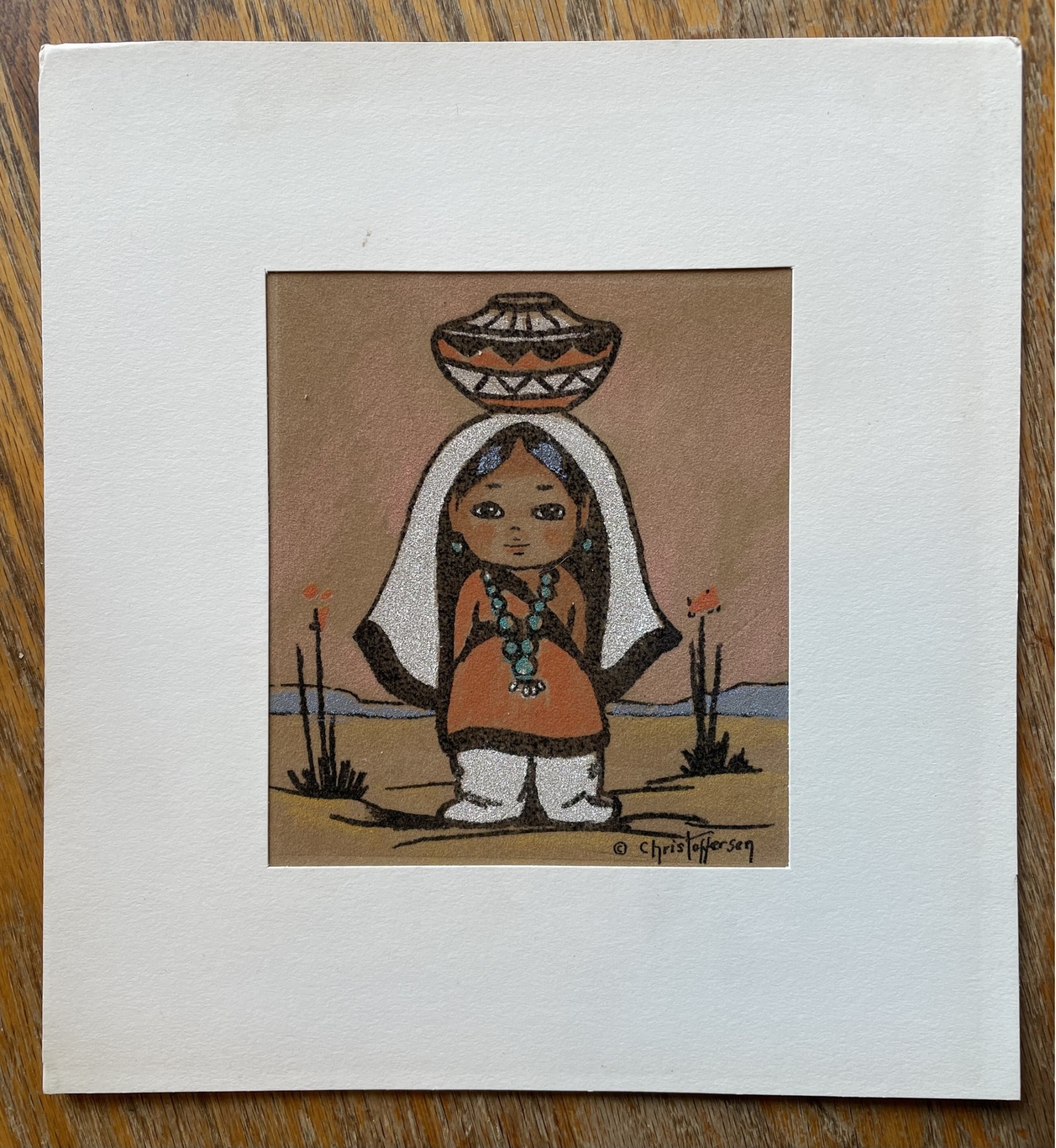 A sweet matted sand art painting from the 1960's by Gerda Christoffersen of an Oodee, they are 1" high mythological characters. The piece is done on suede paper. The last photo has more information that I found online.
