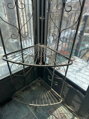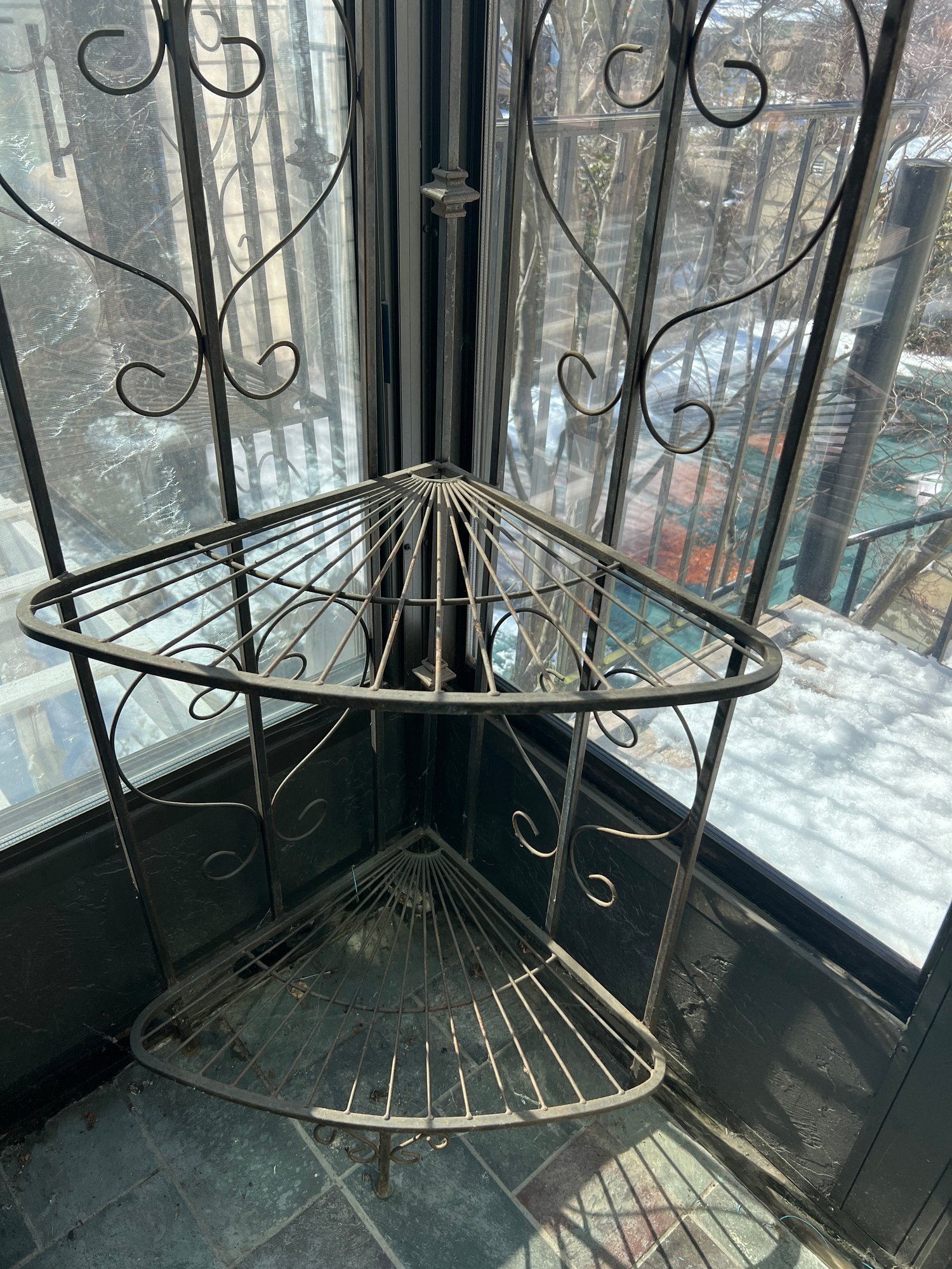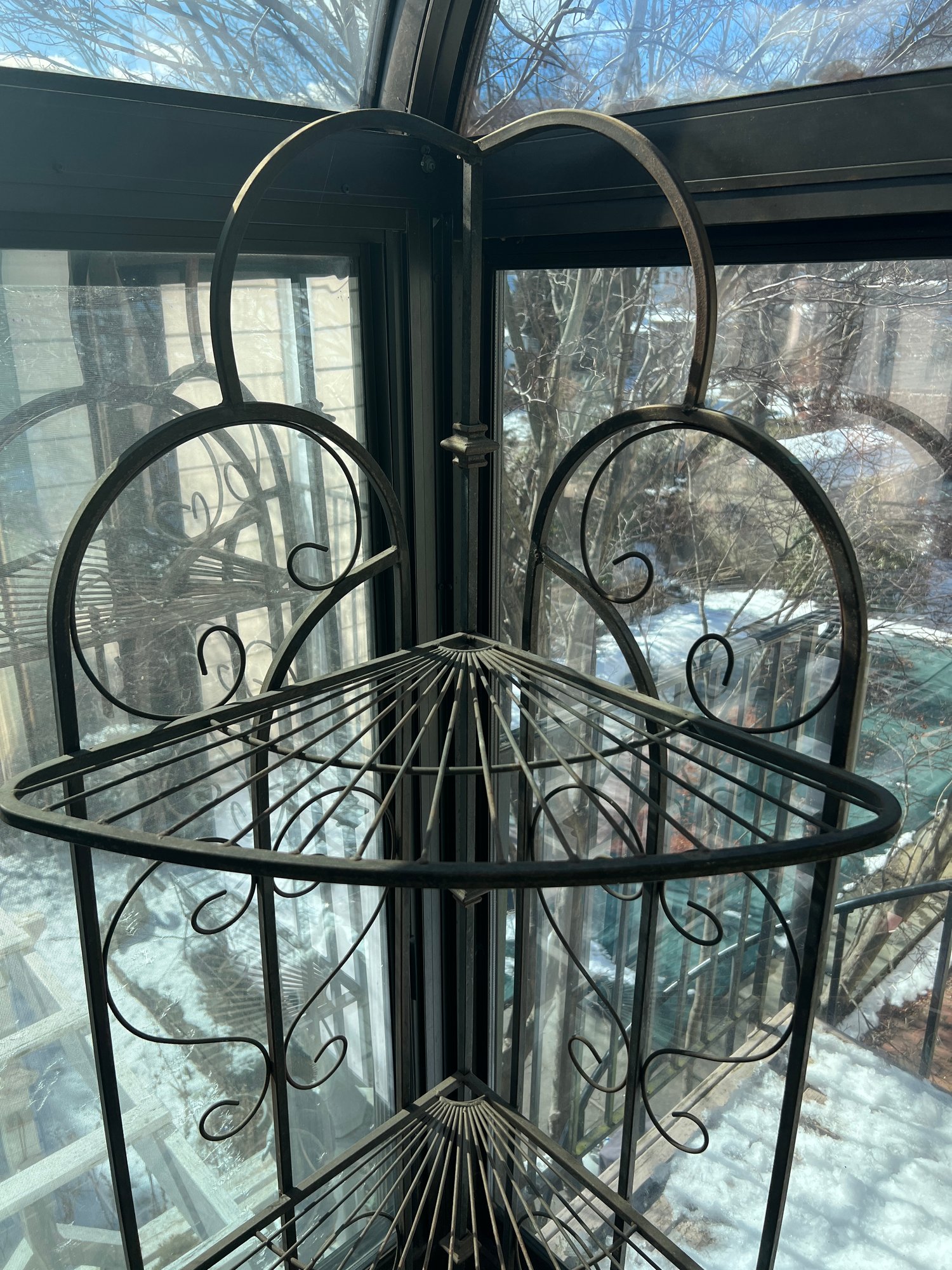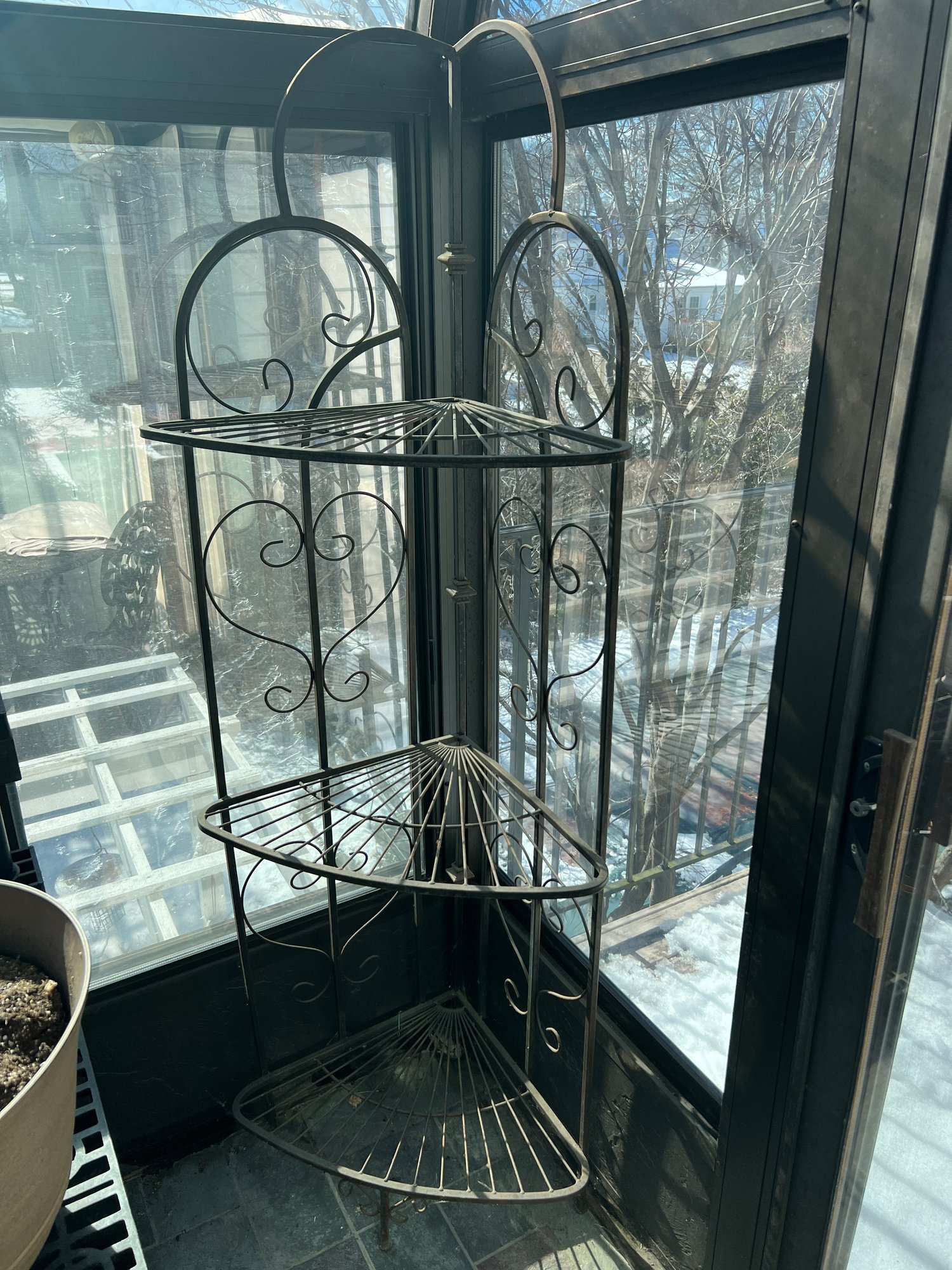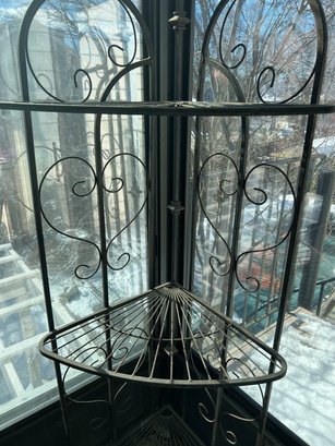 Substantially sized vintage black painted scrolled metal corner plant stand with arched top and heart motif.
