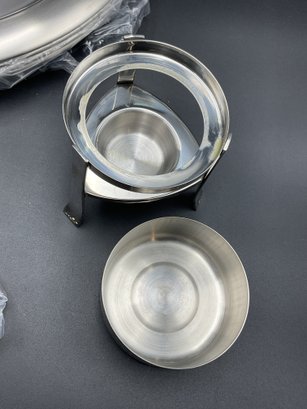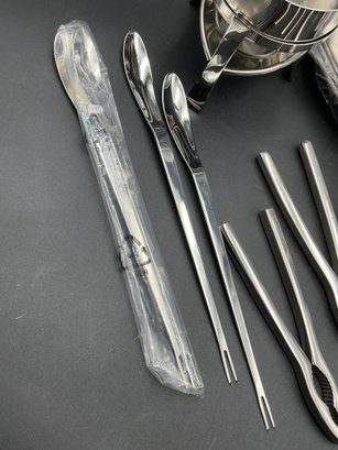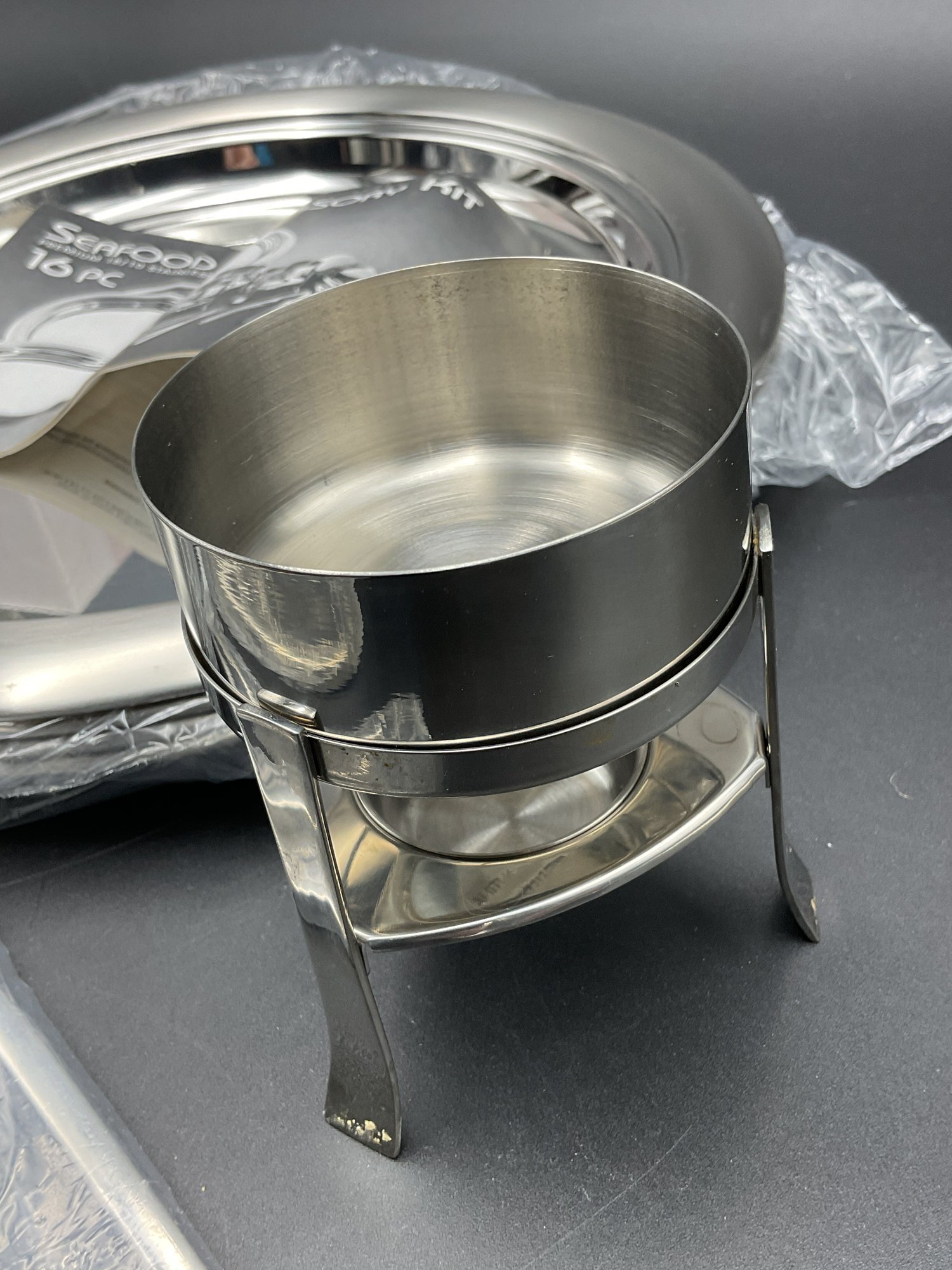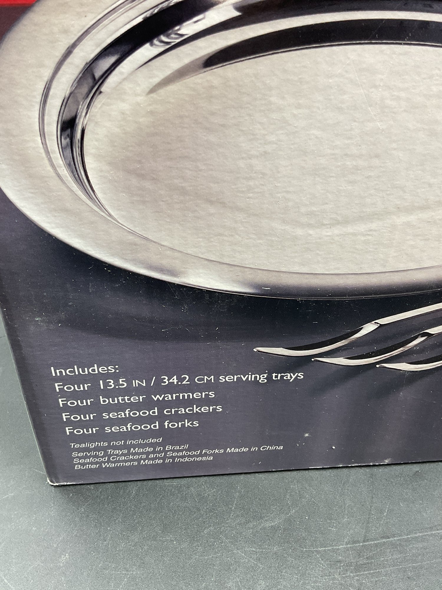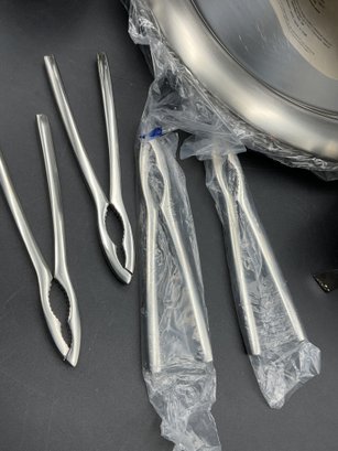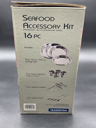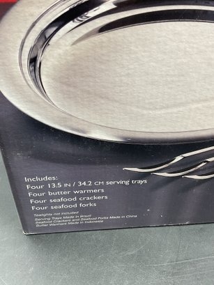 Complete 16 piece set of stainless steel items for your seafood feast with original packaging and paperwork. It appears only 2 of each item was ever used and the others are still sealed up. Includes four of each: large 13.5" platters, butter warmers (require tea lights), shell crackers, and double ended fork/spoon utensils. All in excellent condition.
