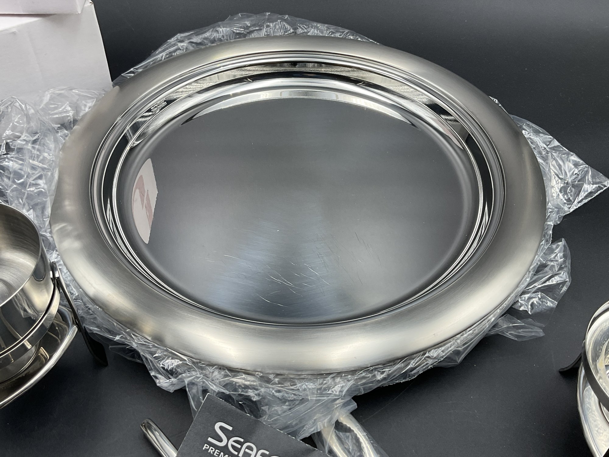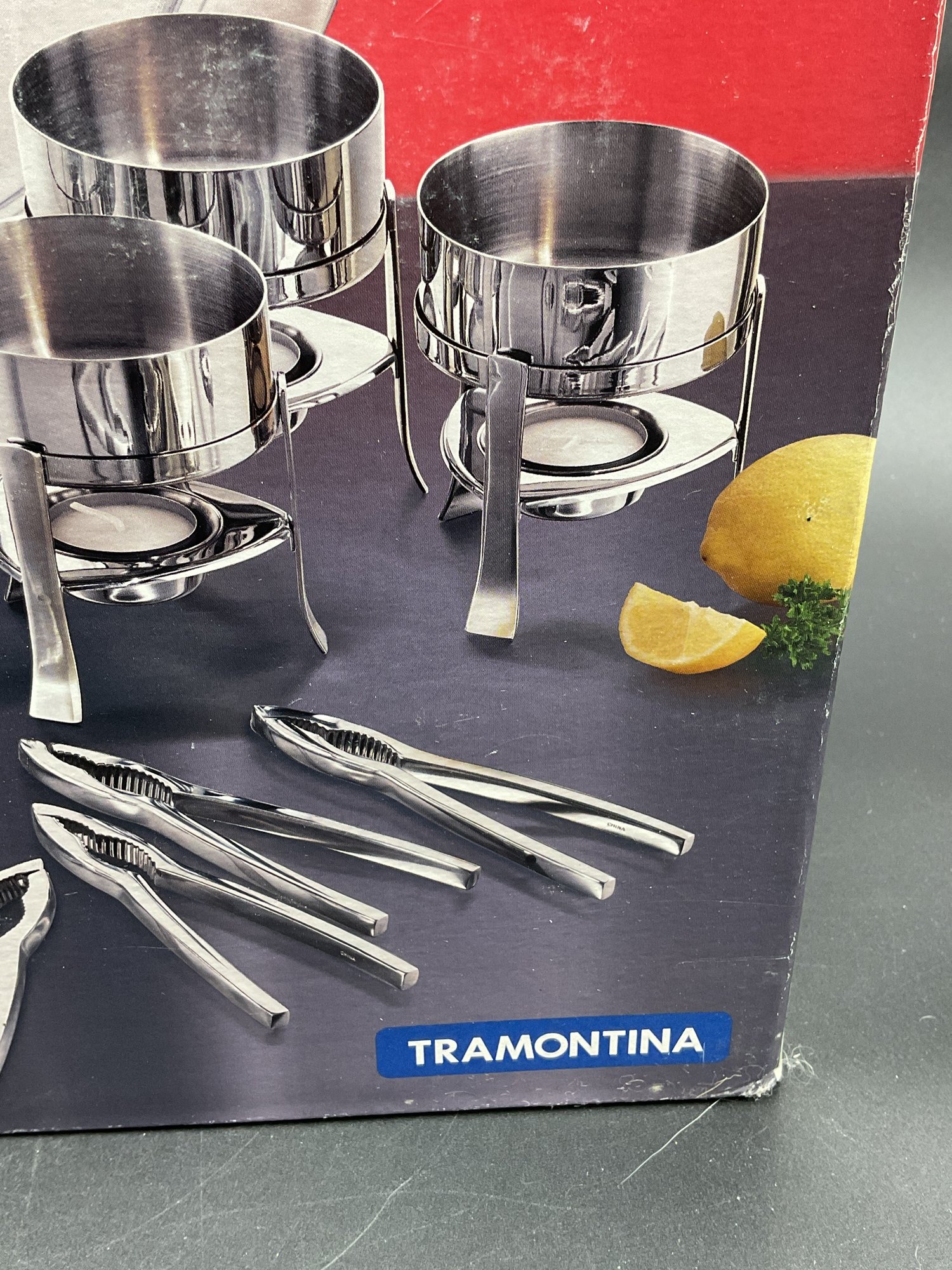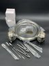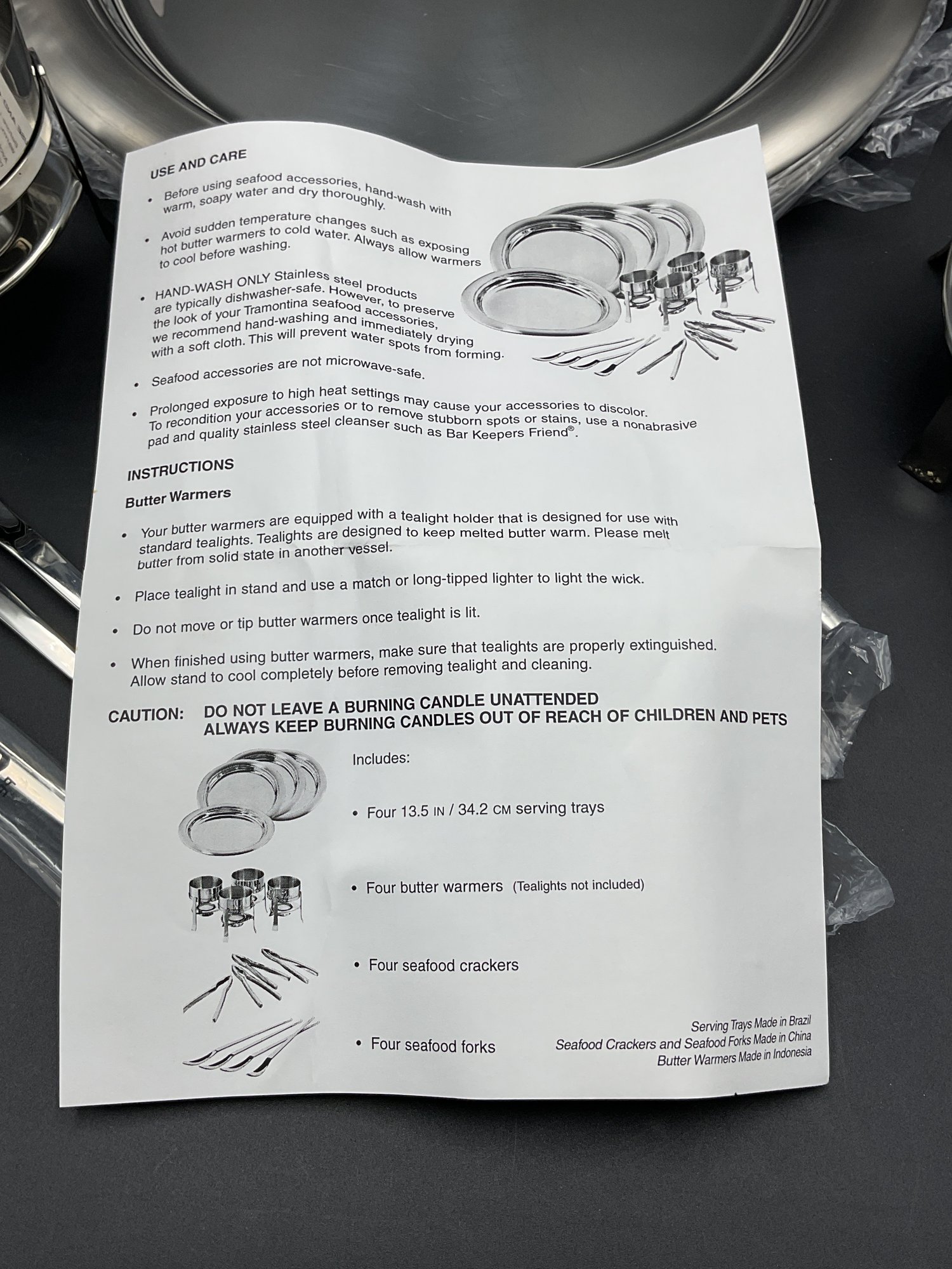 Complete 16 piece set of stainless steel items for your seafood feast with original packaging and paperwork. It appears only 2 of each item was ever used and the others are still sealed up. Includes four of each: large 13.5" platters, butter warmers (require tea lights), shell crackers, and double ended fork/spoon utensils. All in excellent condition.