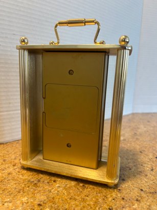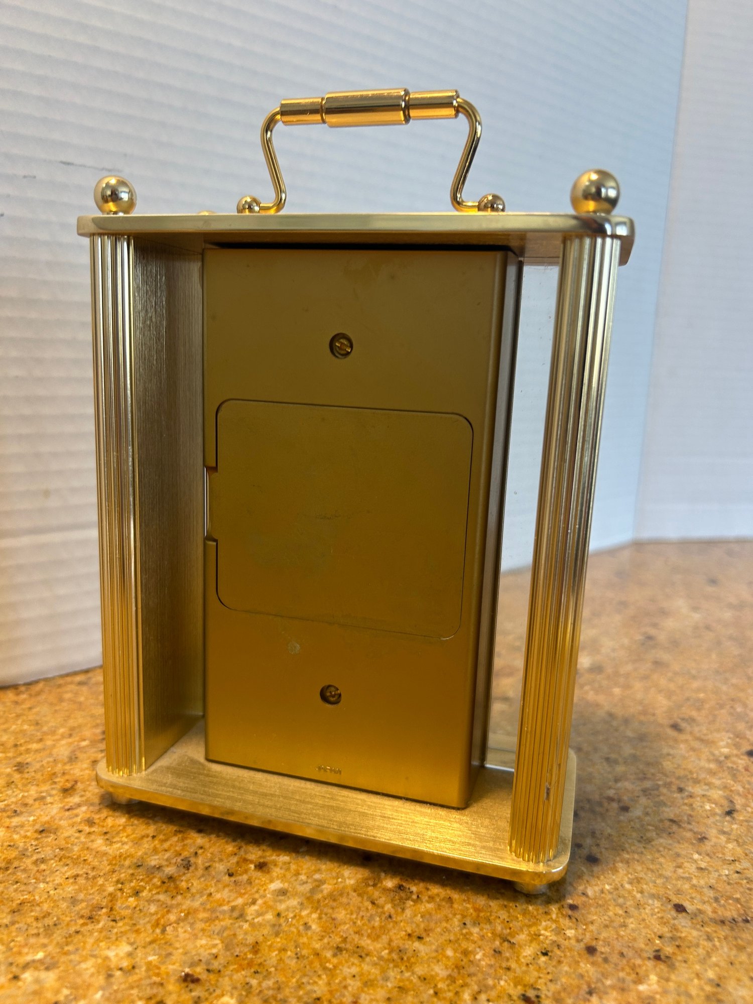 • Seiko Clock: A traditional rectangular "Peyton style" carriage clock in a polished gold-tone finish. Features an ivory face with crisp black Roman numerals and a reliable Japanese quartz movement. Includes a top stationary handle and ball feet.