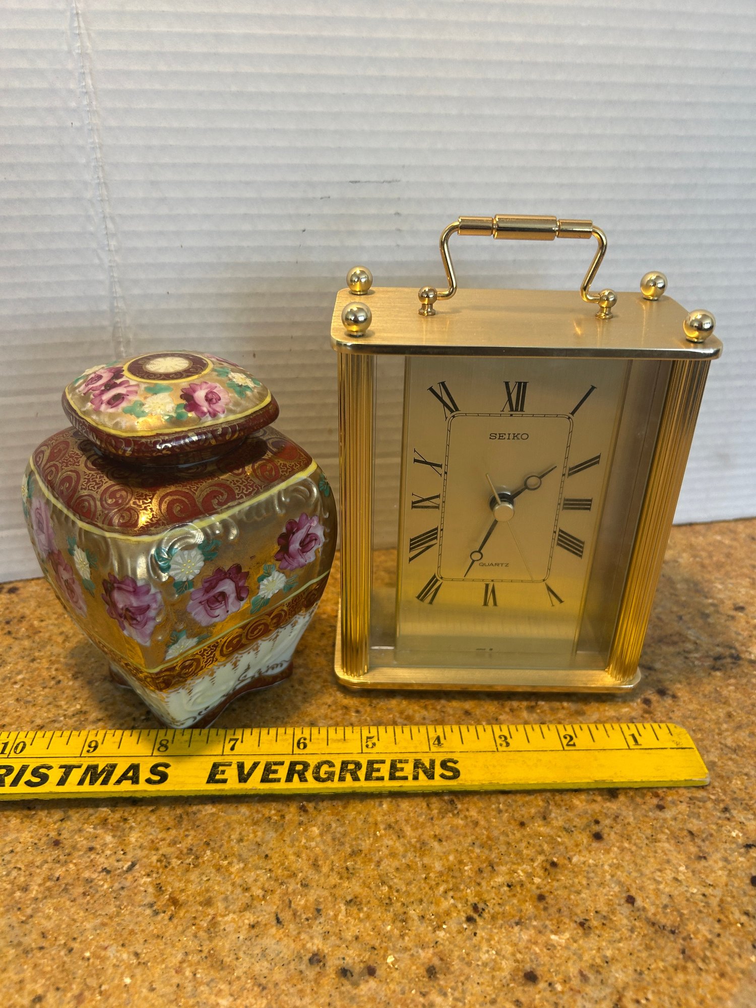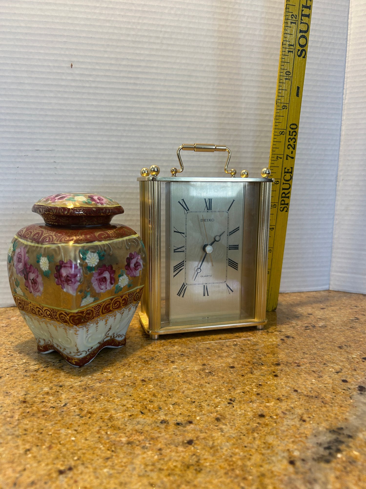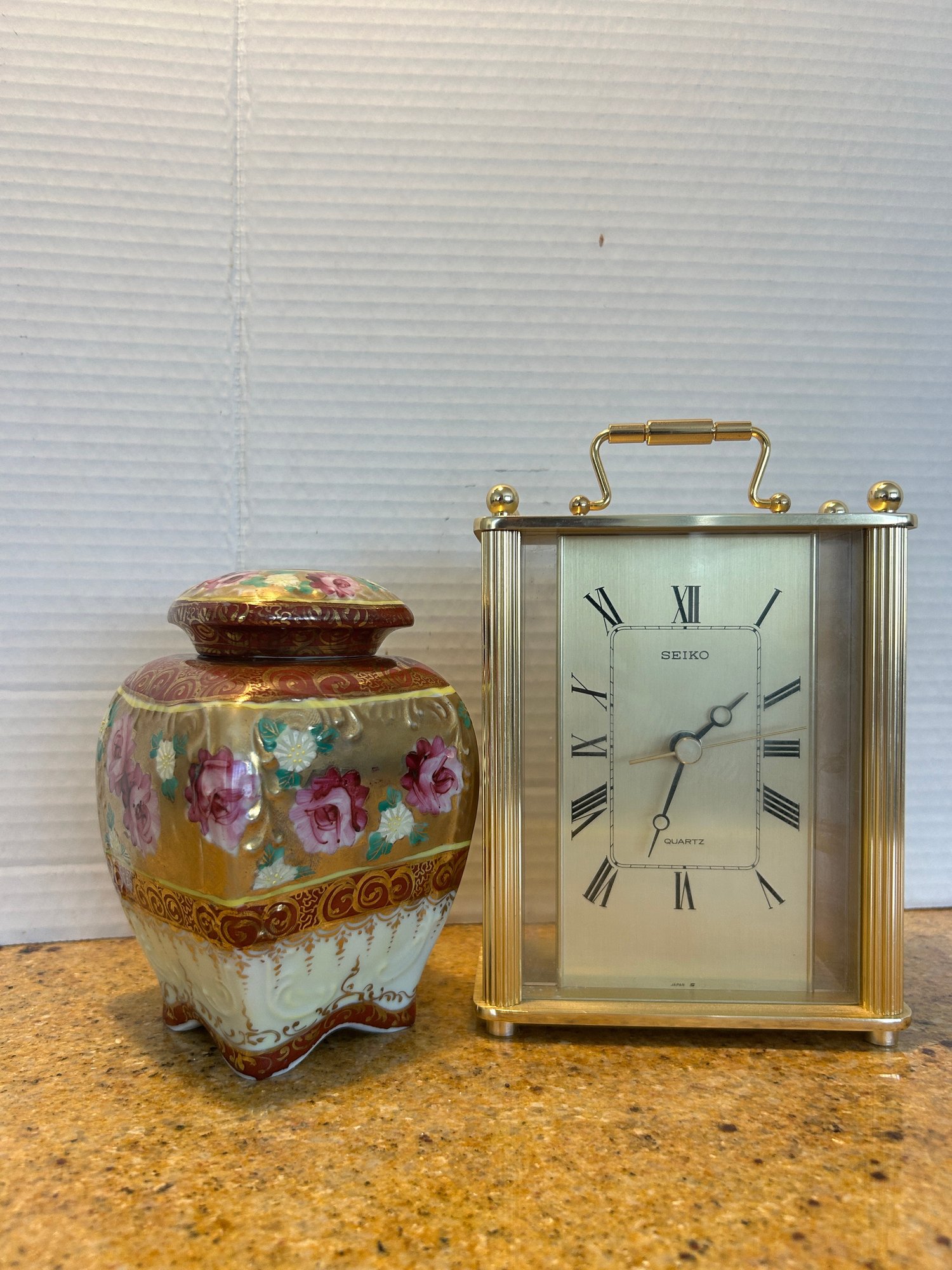 • Condition: Both pieces show well. The clock face is clear; the jar retains its bright gold luster and floral detail with no visible chips.