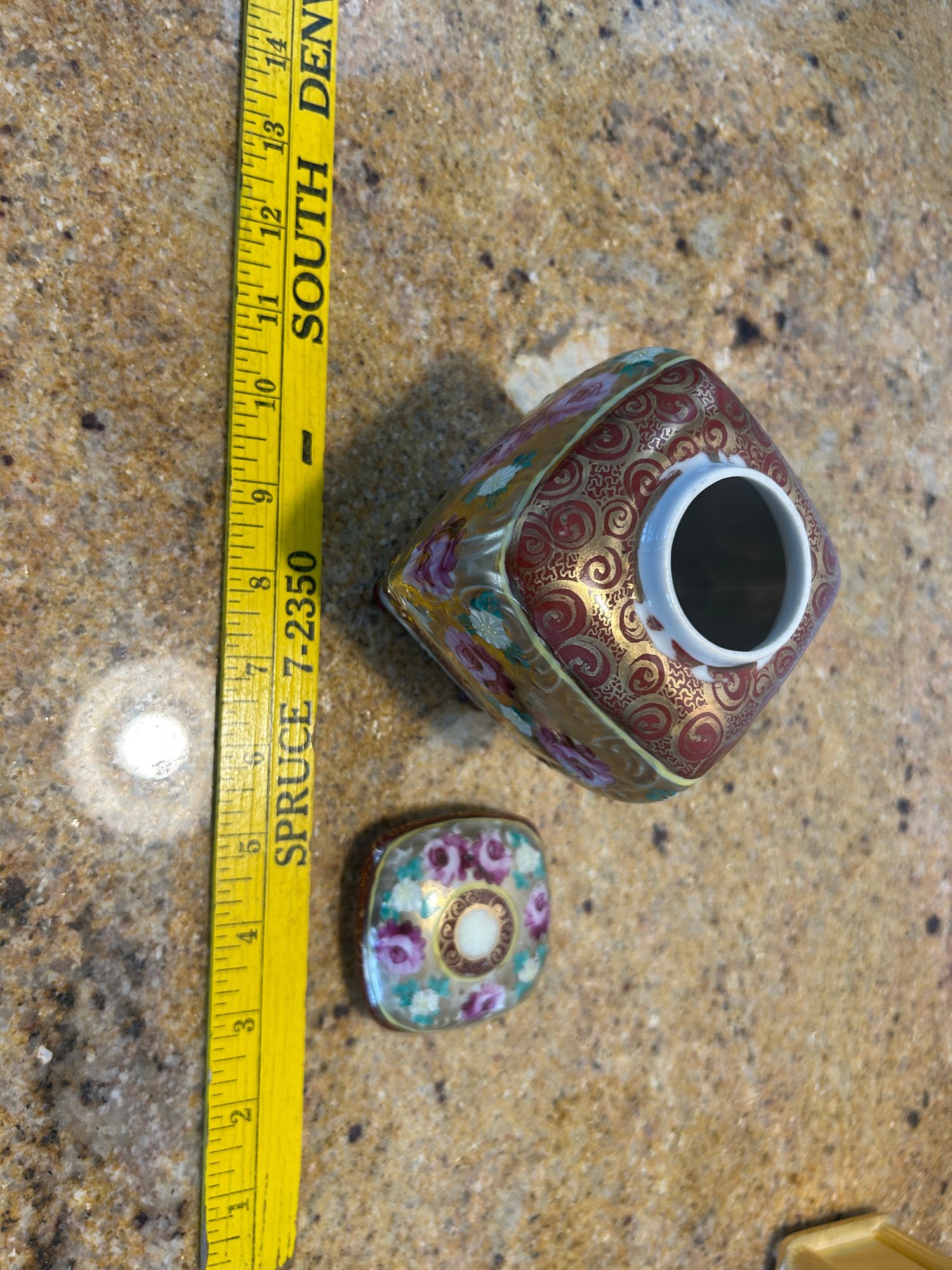 • Porcelain Jar: A small, footed ginger jar or tea caddy featuring vibrant hand-painted pink roses and white floral motifs over a rich gold-leaf background. The jar includes a matching fitted lid and decorative scrolling patterns along the base.