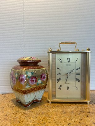 A sophisticated two-piece decorative set featuring a classic timepiece and a hand-decorated ceramic vessel.