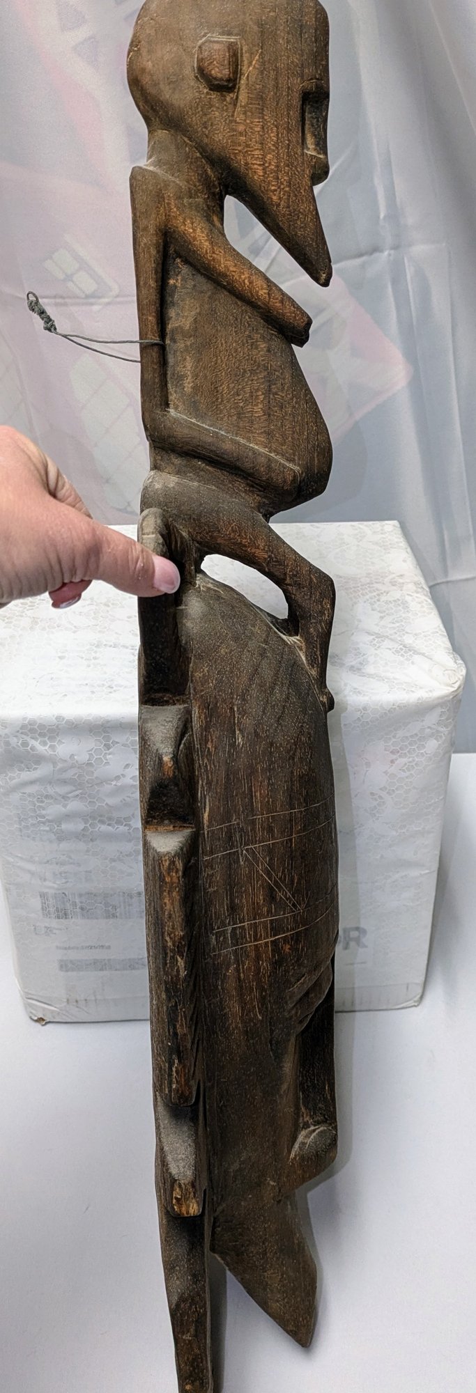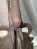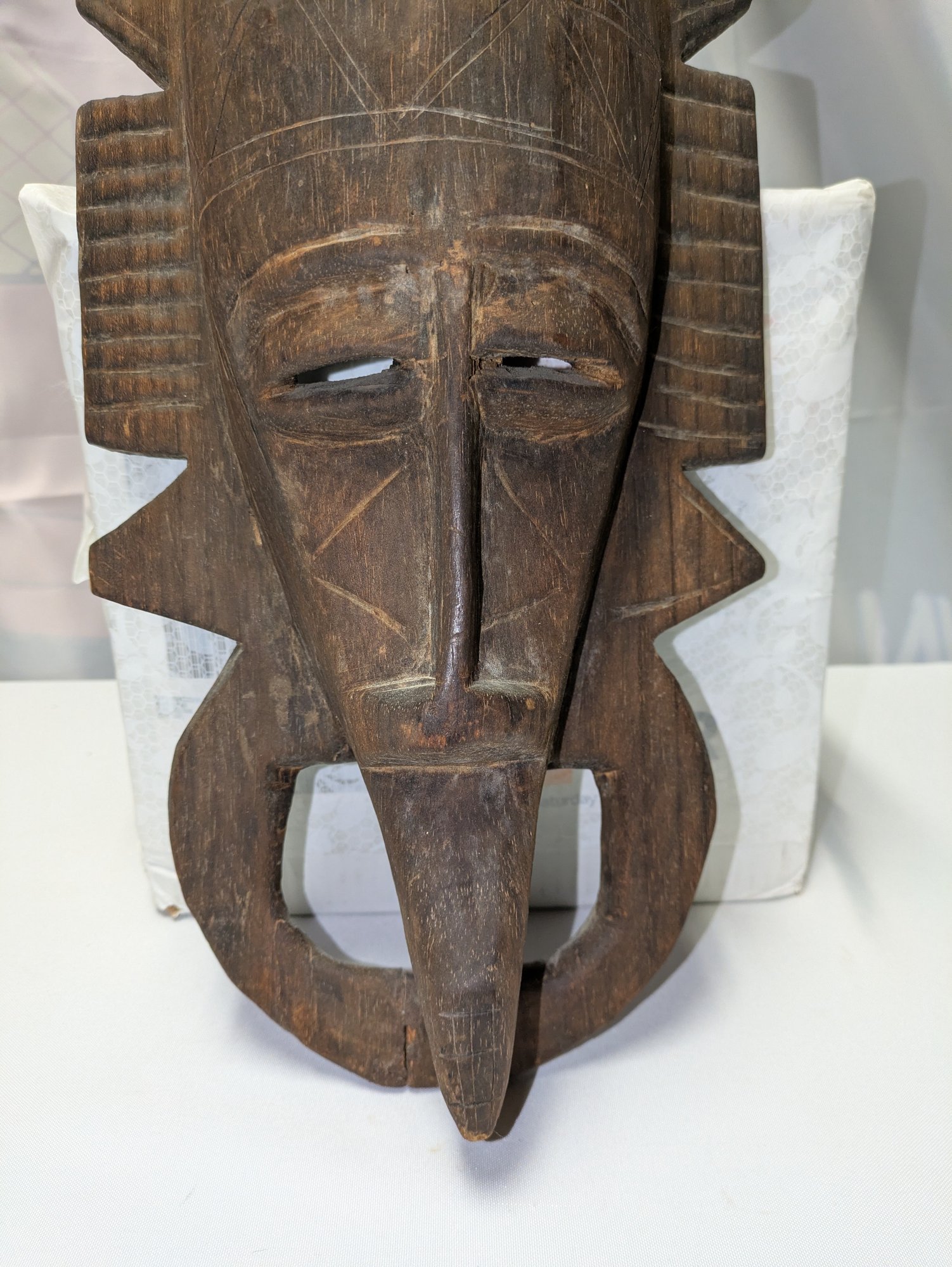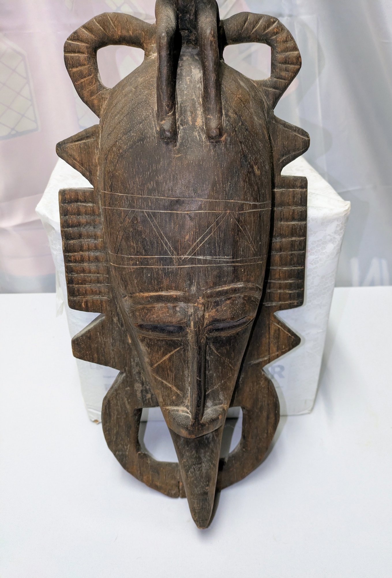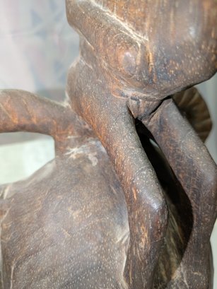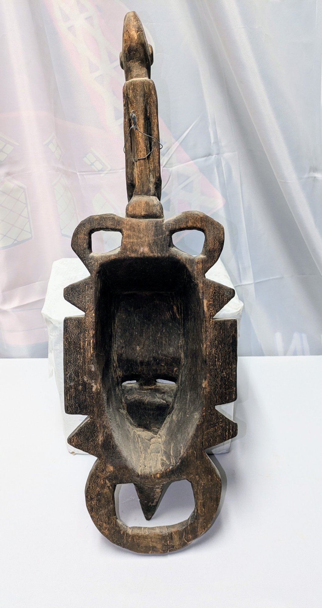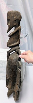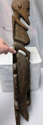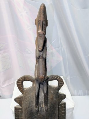 Hand-carved wooden mask traditionally used by men during initiation, funeral, and harvest rituals to represent feminine beauty. This mask style features a sculpted monkey seated atop the head and is finished with a dark patina. Normal marks and wear, consistent with age and movement. Overall, Very Good Vintage Condition. Please see all photos as part of the description and condition. 27.5"H x 9" x 4.25"D