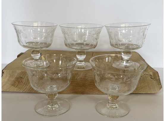 5 vintage glasses with beautiful etched design, in good condition.
