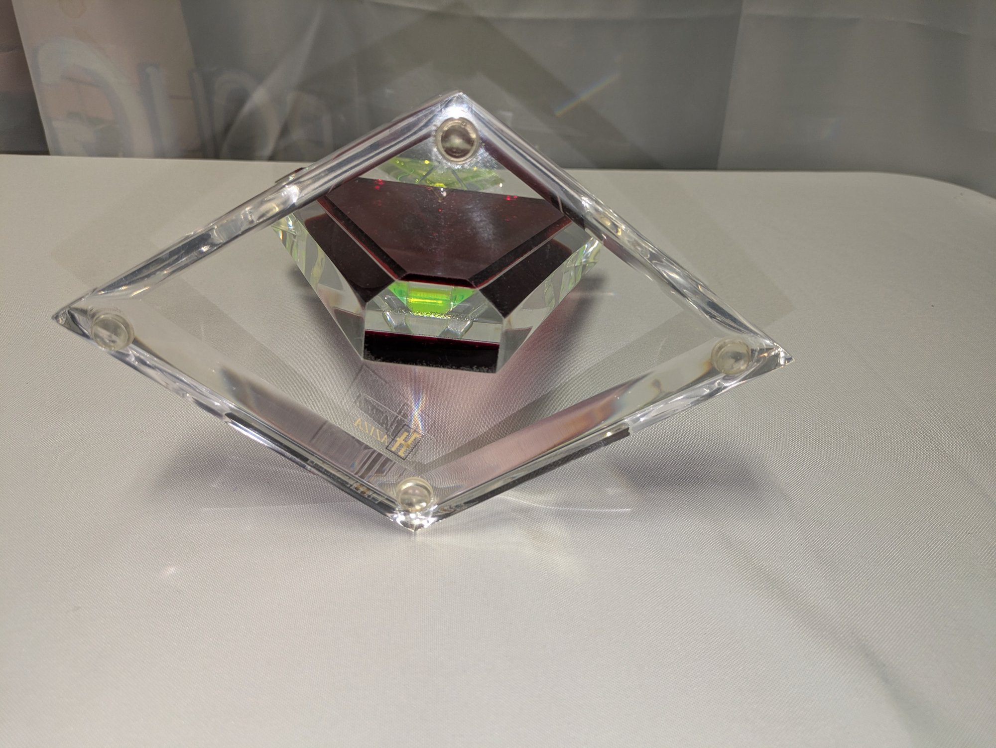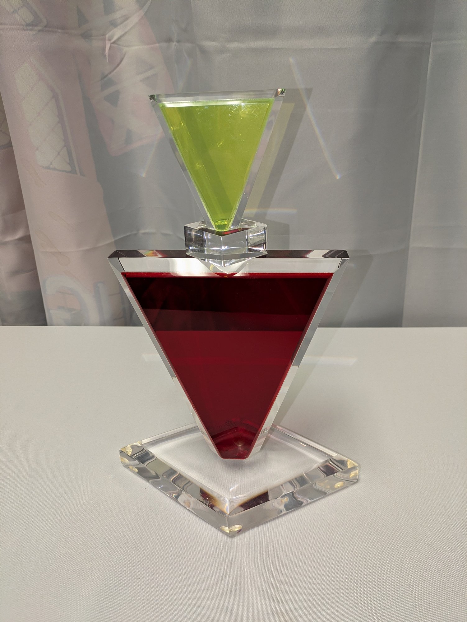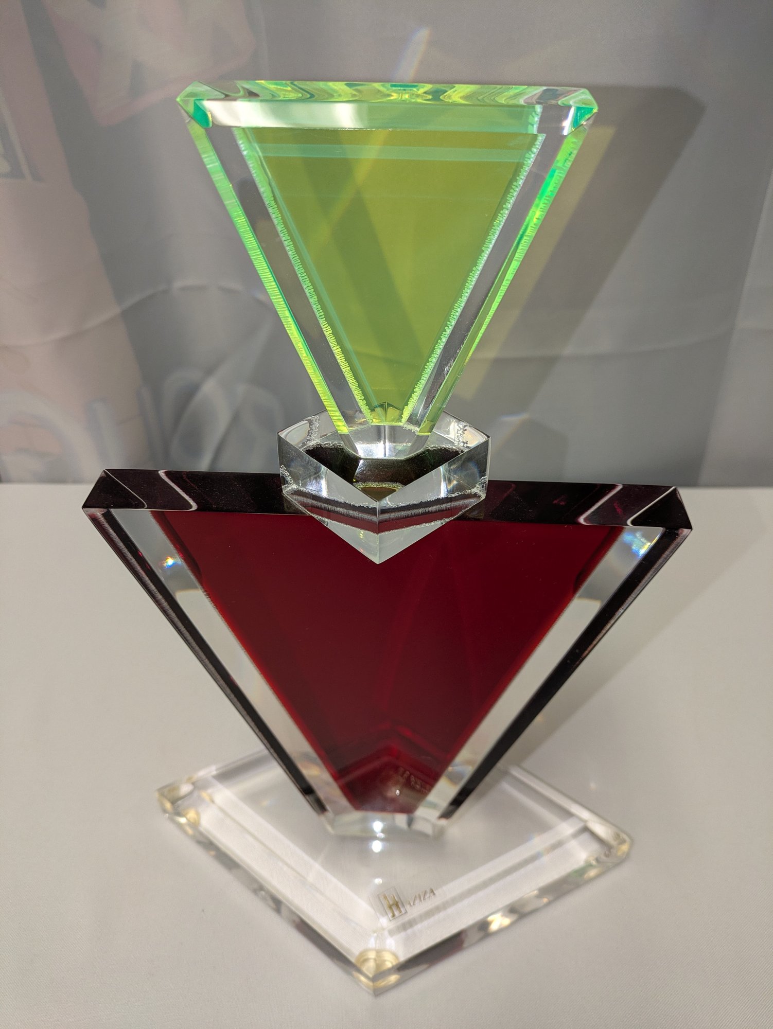 Vintage Shlomi Haziza Abstract Lucite Sculpture in the Shape of a Decanter or Perfume Bottle. Stunning Color Combination and Geometric Design. Excellent Vintage Condition. Please see all photos as part of the description and condition. 14"H x 9.5"W
