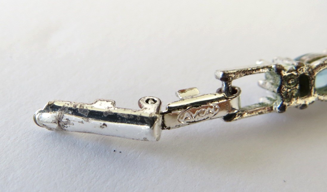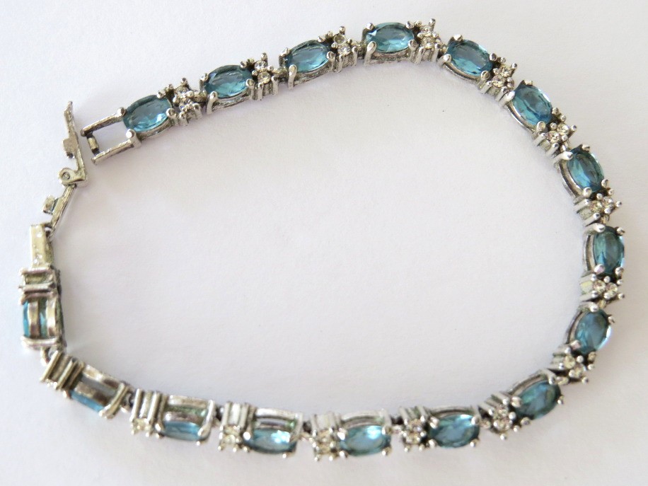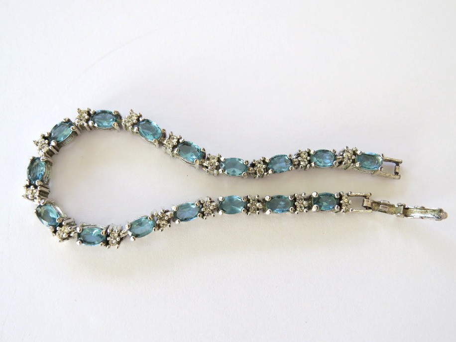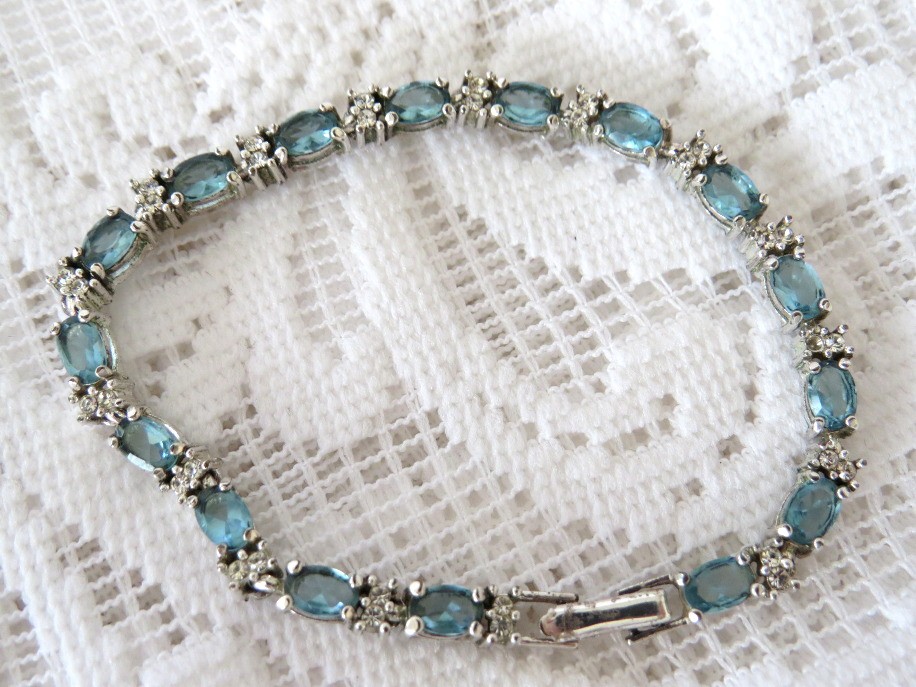 Vintage signed AVON light blue rhinestone with clear accent stones tennis bracelet set in a silver tone finish. Beautiful 1/4" faceted oval blue rhinestones, similar to blue topaz! Bracelet is 7 1/2" in length and has a working clasp.