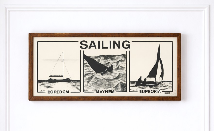 A charming vintage nautical print titled “Sailing,” featuring a humorous three-panel composition labeled “Boredom,” “Mayhem,” and “Euphoria.” Rendered in a classic black-and-white style, the artwork captures the spirit and unpredictability of sailing with a bold, graphic approach.