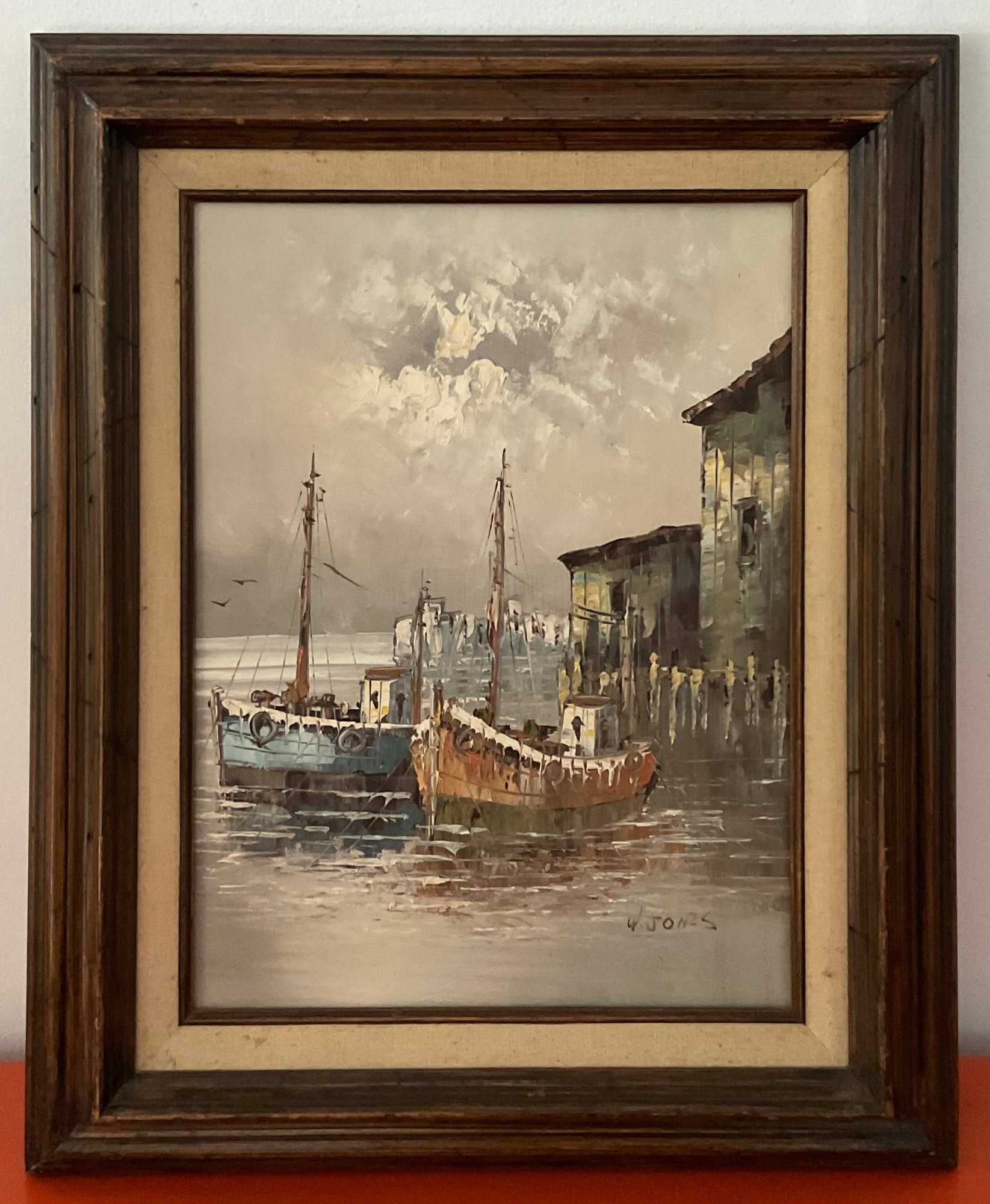 Vintage Signed W. Jones, Oil on Canvas, Boat Scene Painting.