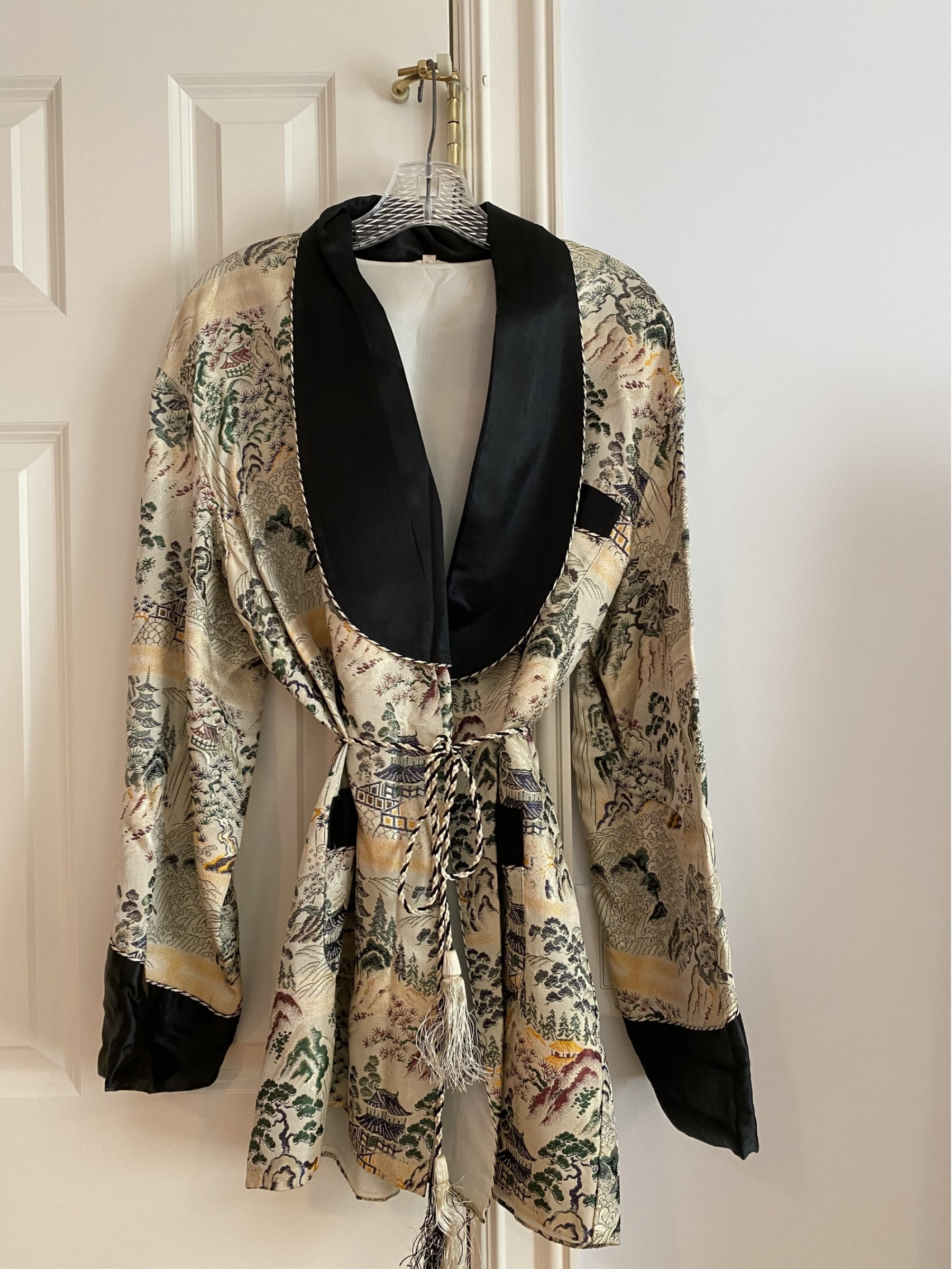 Beautiful everyday robe, with a tasseled silk rope waist belt. Very nice condition overall, with some minor blemishes and discoloration to lining. See all photos for details. Measures 33" L.